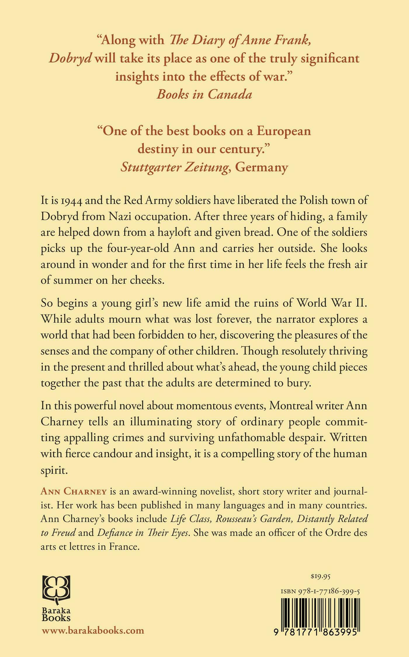 It is 1944 and Red Army soldiers have liberated the Polish town of Dobryd from Nazi occupation. After three years of hiding, a family are helped down from a hayloft and given bread. One of the soldiers picks up a four-year-old child and carries her outside. She looks around in wonder and feels, for the first time in her life, the fresh air of summer on her cheeks.So begins a young girl’s new life amid the ruins of World War II. While adults mourn what was lost forever, the narrator explores a world that had been forbidden to her, discovering the pleasures of the senses and the company of other children. Though resolutely thriving in the present and thrilled about what’s ahead, the young child also pieces together the past that the adults are determined to bury.In this powerful autobiographical novel about momentous events, Montreal writer Ann Charney tells an illuminating story of ordinary people committing appalling crimes and surviving unfathomable despair. Written with fierce candour and insight, it is a compelling story of the human spirit.Ann Charney is an award-winning Canadian novelist, short story writer, and journalist. Dobryd was first published in 1973 and was translated into many languages. Her work has been published in Canada, the U.S., France, Germany, and Italy. Ann Charney’s other books include Life Class, Rousseau’s Garden, Distantly Related to Freud and Defiance in Their Eyes. She has won Canadian National Magazine Awards both for her fiction and non-fiction and was made an officer of the Ordre des arts et lettres in France. Ann Charney lives in Montreal.Peter McFarlane is an author, journalist, editor, and arts administrator. His most recent book, which was inspired by Dobryd, is Family Ties, How a Ukrainian Nazi and a Living Witness link Canada to Ukraine today. Author of numerous articles, he is also the editor of several award-winning titles including Unsettling Canada. He lives north of Montreal.Reviews and Praise“Along with The Diary of Anne Frank . . . Dobryd will take its place as one of the truly significant insights into the effects of war.” Books in Canada“A tale told with great skill and simplicity; her book is a tour de force.” Maclean’s“A ‘marvelous’ autobiographical novel of a Jewish girl emerging from hiding in Poland after the defeat of the Nazis, and rediscovering freedom and hope.” Publishers Weekly“One of the best books on a European destiny in our century.” Stuttgarter Zeitung, Germany“Original and compelling, this book makes us believe in the possibility of happiness amid the terrors of war.” Frankfurter Neue Presse, Germany“A terrifying and inspiring story of war seen through the eyes of a child.” L’express, Belgium“An extraordinary testimonial to the strength of the human spirit, even in the worst times.” Flair, Belgium“The novel’s unsentimental, clear-eyed vision offers hope that, with luck, the human spirit can blossom under the most dreadful circumstances.” Mary Soderstrom