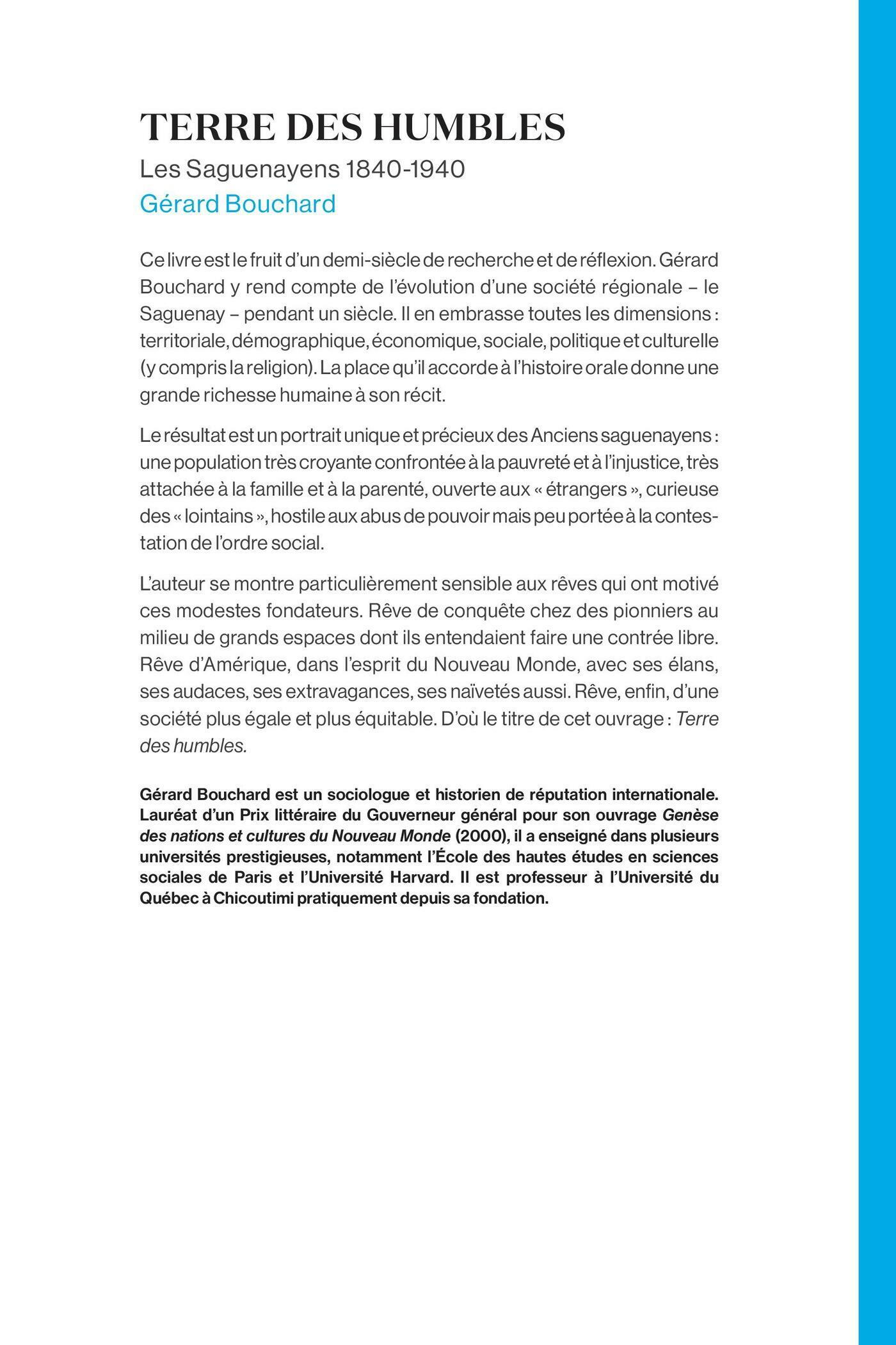 Ce livre est consacré à la reconstitution des rêves et des revers d’une société neuve. Gérard Bouchard y rend compte de l’évolution d’une société régionale – le Saguenay, de 1840 à 1940 – en suivant la démarche de l’histoire sociale. Il en embrasse ainsi toutes ses dimensions: territoriale, démographique, économique, sociale, politique et culturelle (y compris la religion). Il fait également ressortir les interactions entre ces sphères de façon à obtenir une vision dynamique de l’ensemble de cette société.