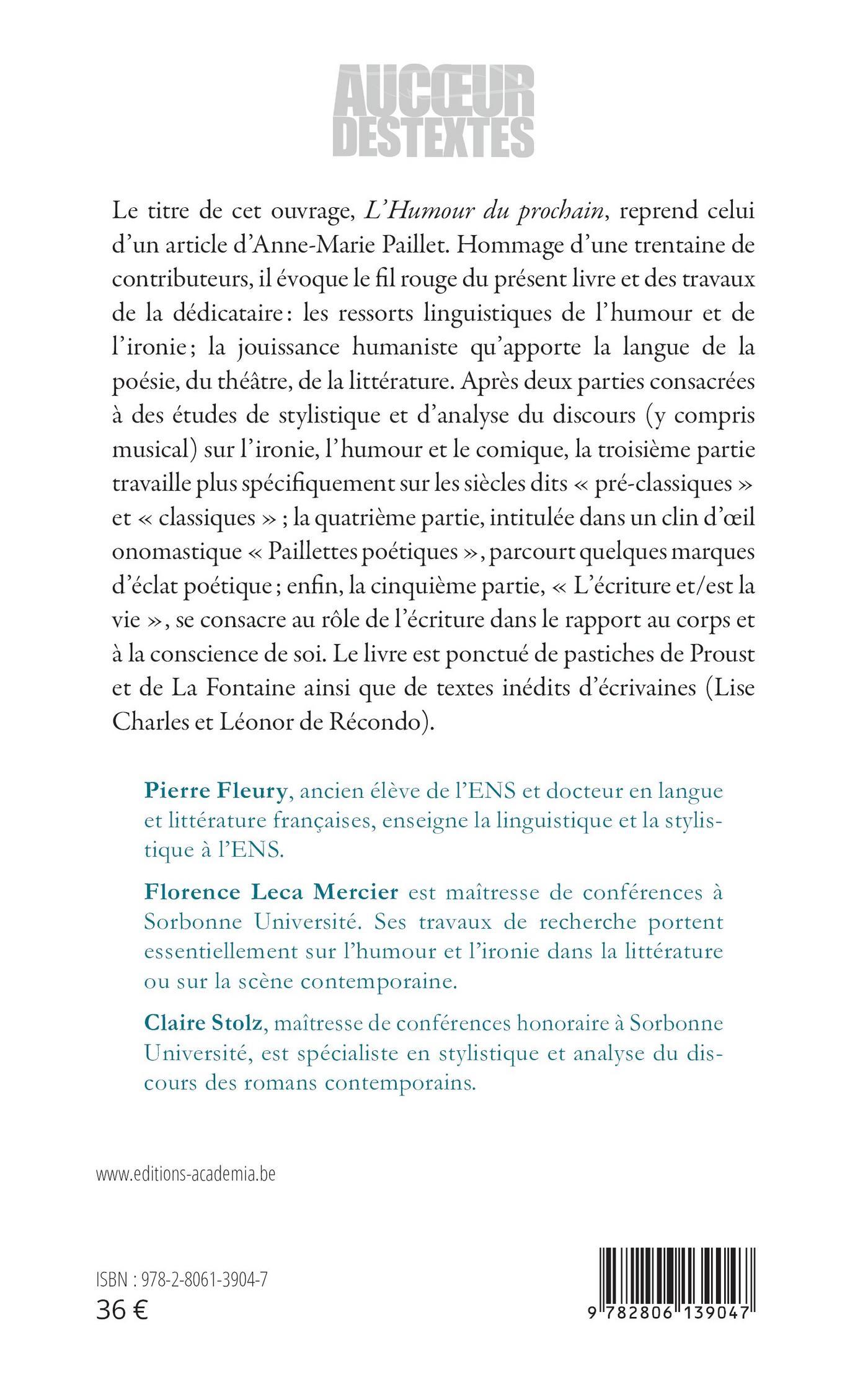 Le titre de cet ouvrage, L’Humour du prochain, reprend celui d’un article d’Anne-Marie Paillet. Hommage d’une trentaine de contributeurs, il évoque le fil rouge du présent livre et des travaux de la dédicataire : les ressorts linguistiques de l’humour et de l’ironie ; la jouissance humaniste qu’apporte la langue de la poésie, du théâtre, de la littérature. Après deux parties consacrées à des études de stylistique et d’analyse du discours (y compris musical) sur l’ironie, l’humour et le comique, la troisième partie travaille plus spécifiquement sur les siècles dits « pré-classiques » et « classiques » ; la quatrième partie, intitulée dans un clin d’oeil onomastique « Paillettes poétiques », parcourt quelques marques d’éclat poétique ; enfin, la cinquième partie, « L’écriture et/est la vie », se consacre au rôle de l’écriture dans le rapport au corps et à la conscience de soi. Le livre est ponctué de pastiches de Proust et de La Fontaine ainsi que de textes inédits d’écrivaines (Lise Charles et Léonor de Récondo).