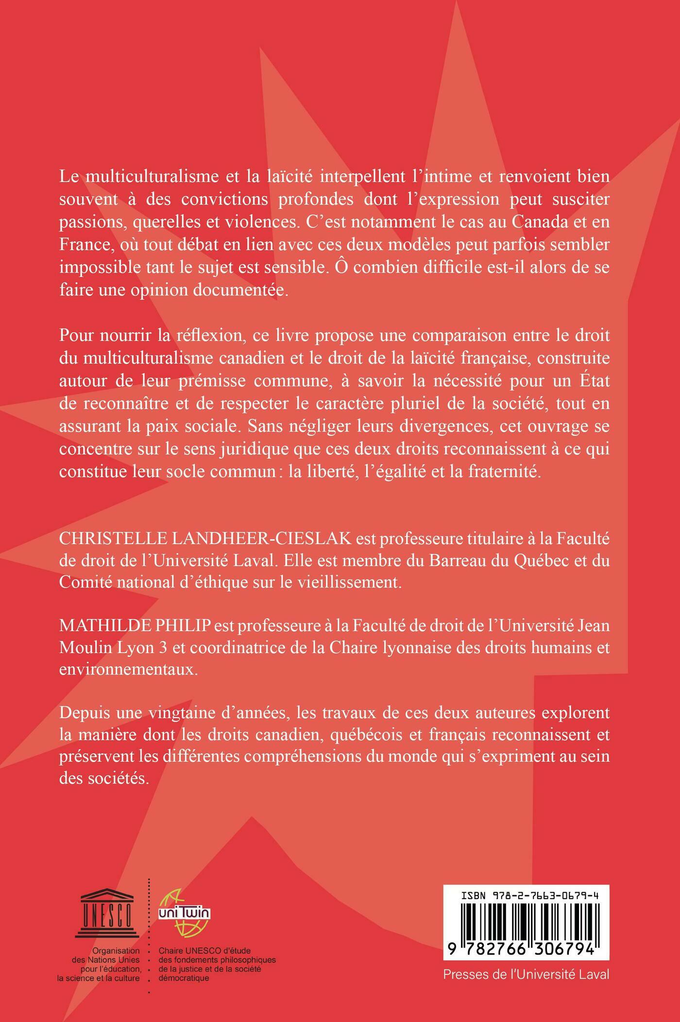 Pour nourrir la réflexion, ce livre propose une comparaison entre le droit du multiculturalisme canadien et le droit de la laïcité française, construite autour de leur prémisse commune, à savoir la nécessité pour un État de reconnaître et de respecter le caractère pluriel de la société, tout en assurant la paix sociale. Sans négliger leurs divergences, cet ouvrage se concentre sur le sens juridique que ces deux droits reconnaissent à ce qui constitue leur socle commun : la liberté, l’égalité et la fraternité.