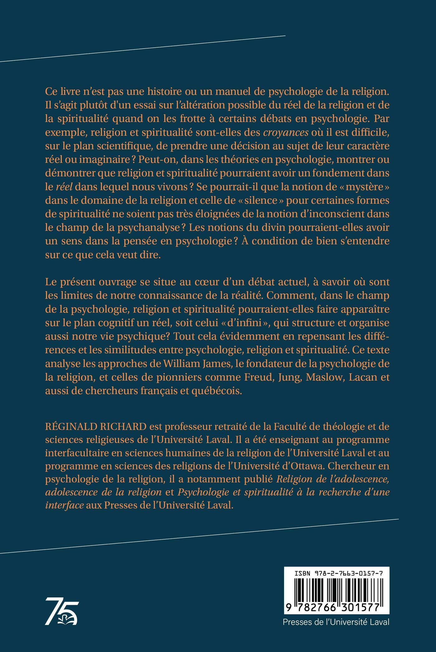 Le présent ouvrage se situe au cœur d’un débat actuel, à savoir où sont les limites de notre connaissance de la réalité. Comment, dans le champ de la psychologie, religion et spiritualité pourraient-elles faire apparaître sur le plan cognitif un réel, soit celui « d’infini », qui structure et organise aussi notre vie psychique? Tout cela évidemment en repensant les différences et les similitudes entre psychologie, religion et spiritualité. Ce texte analyse les approches de William James, le fondateur de psychologie de la religion, et celles de pionniers comme Freud, Jung, Maslow, Lacan et aussi de chercheurs européens et québécois.