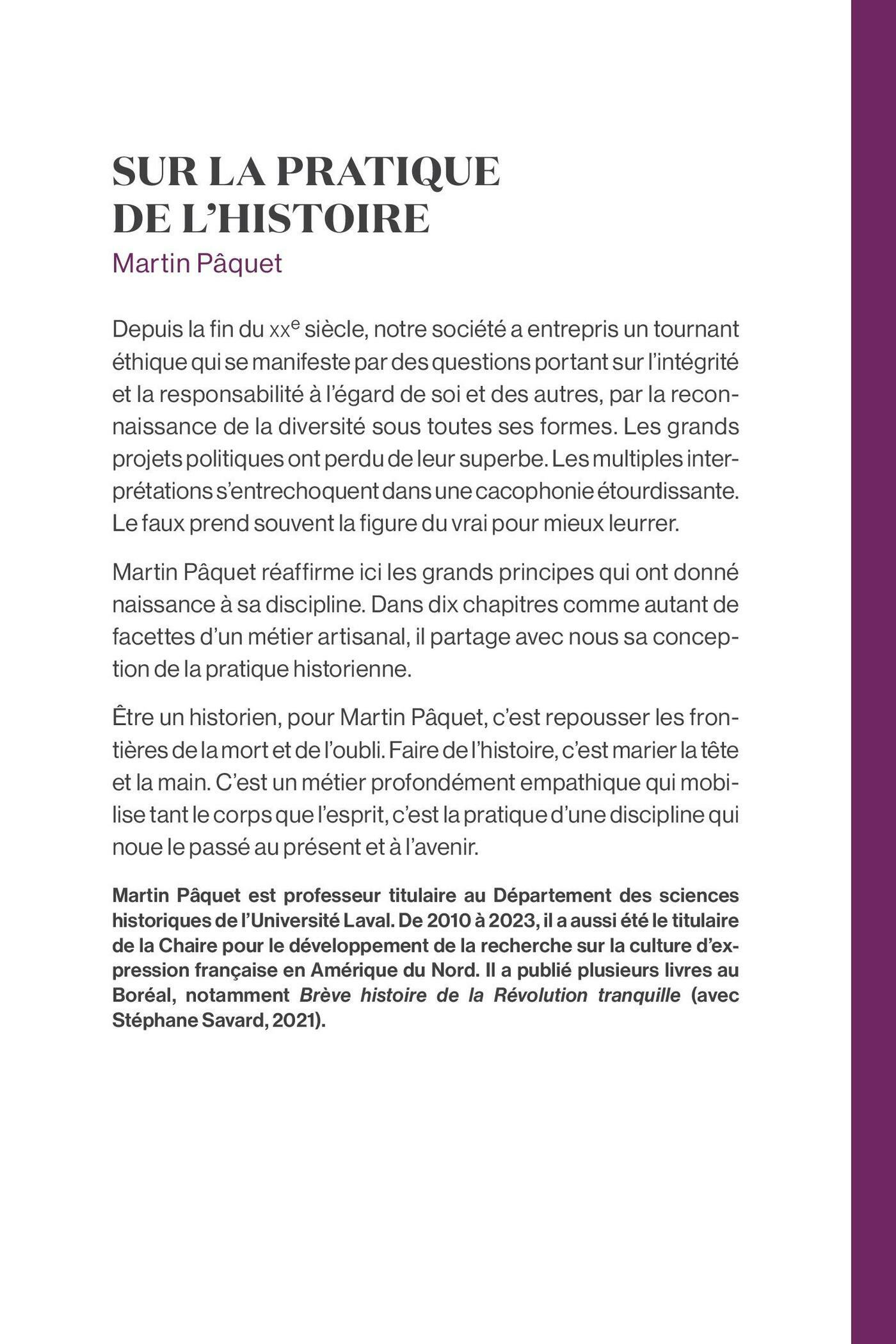 Être un historien, pour Martin Pâquet, c’est repousser les frontières de la mort et de l’oubli; c’est aussi aimer la vie dans ce qu’elle a d’essentiel et de signifiant, de fragile et de labile. Faire de l’histoire, c’est marier la tête et la main, c’est dialoguer avec les êtres humains de jadis et d’aujourd’hui. C’est un métier profondément empathique qui mobilise tant le corps que l’esprit, c’est la pratique d’une discipline qui noue le passé au présent et à l’avenir.