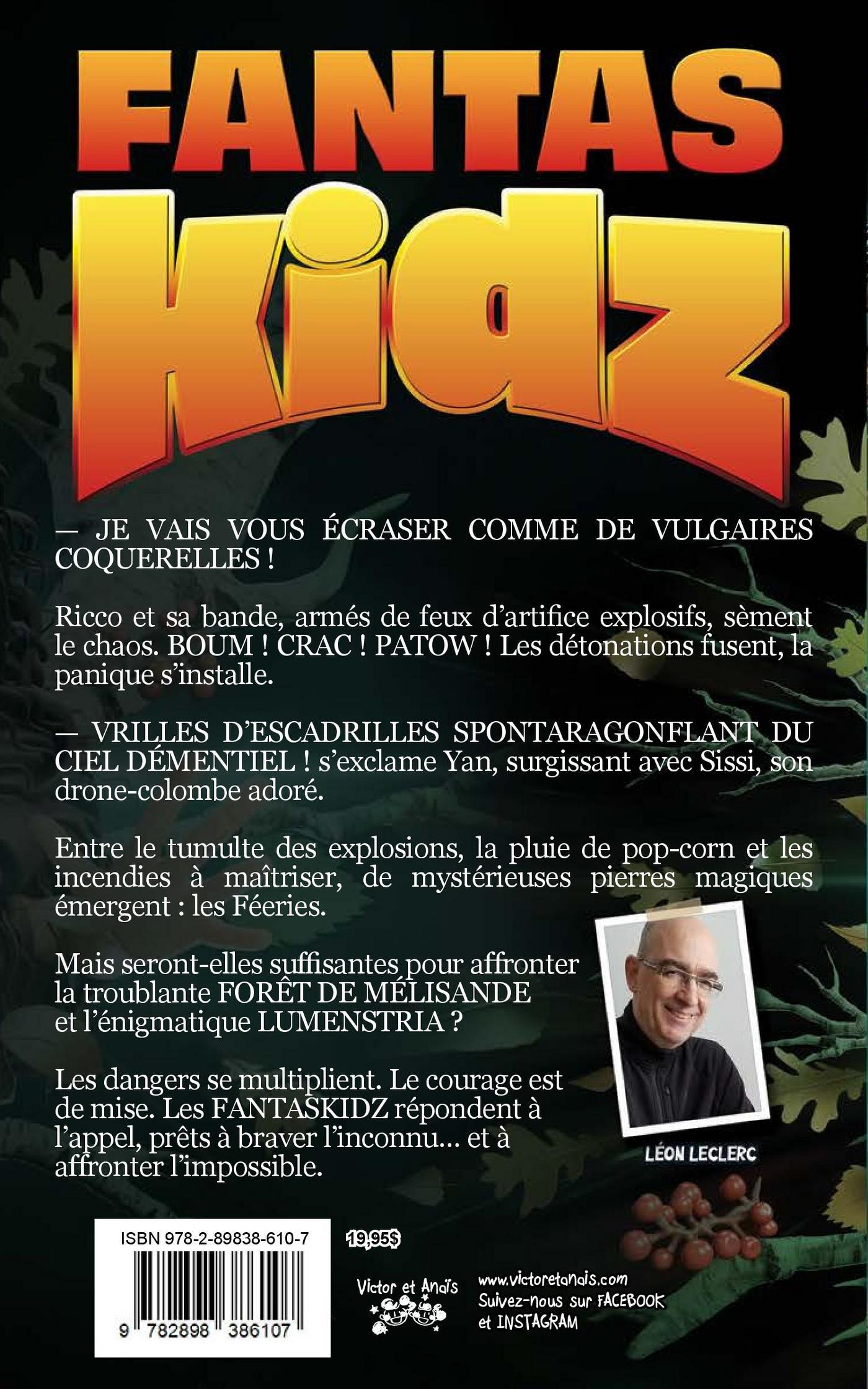 — JE VAIS VOUS ÉCRASER COMME DE VULGAIRES COQUERELLES ! Ricco et sa bande, armés de feux d’artifice explosifs, sèment le chaos. BOUM ! CRAC ! PATOW ! Les détonations fusent, la panique s’installe. — VRILLES D’ESCADRILLES SPONTARAGONFLANT DU CIEL DÉMENTIEL ! s’exclame Yan, surgissant avec Sissi, son drone-colombe adoré. Entre le tumulte des explosions, la pluie de pop-corn et les incendies à maîtriser, de mystérieuses pierres magiques émergent : les Féeries. Mais seront-elles suffisantes pour affronter la troublante FORÊT DE MÉLISANDE et l’énigmatique LUMENSTRIA ? Les dangers se multiplient. Le courage est de mise. Les FANTASKIDZ répondent à l’appel, prêts à braver l’inconnu… et à affronter l’impossible.