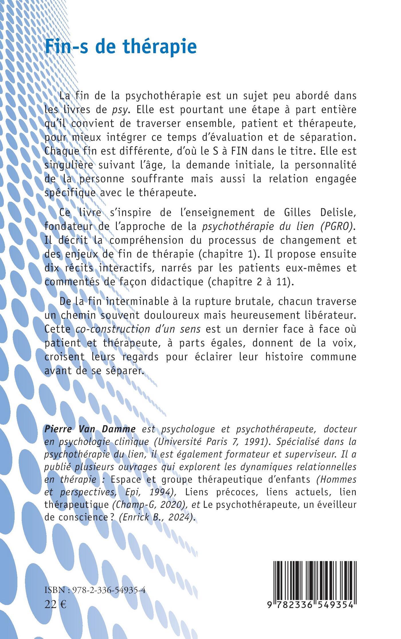 La fin de la psychothérapie est un sujet peu abordé dans les livres de psy. Elle est pourtant une étape à part entière qu’il convient de traverser ensemble, patient et thérapeute, pour mieux intégrer ce temps d’évaluation et de séparation. Chaque fin est différente, d’où le S à FIN dans le titre. Elle est singulière suivant l’âge, la demande initiale, la personnalité de la personne souffrante mais aussi la relation engagée spécifique avec le thérapeute.