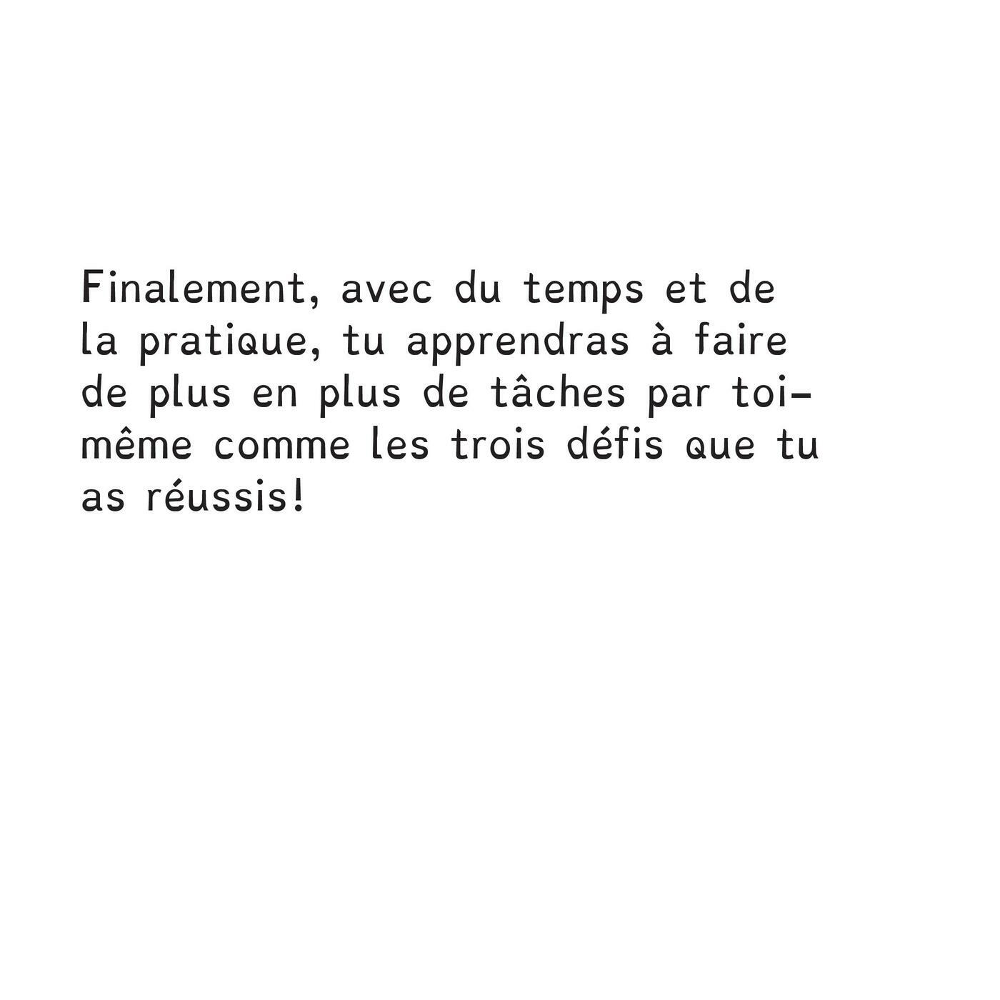 Dans ce livre, votre enfant devra relever trois défis pour découvrir des exemples de tâches qu’il peut réaliser pour vous aider (ranger ses effets personnels au bon endroit, mettre la table et déposer ses déchets dans les bons bacs).Il s’agit d’une façon amusante d’introduire les tâches auprès de votre enfant. Bonne lecture !