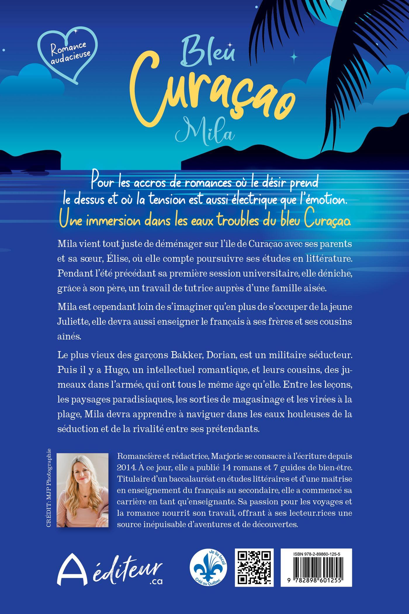 Pour les accros de romances où le désir prend la tension est aussi électrique que l’émotion. Une immersion dans les eaux troubles du bleu Curaçao. Mila vient tout juste de déménager sur l’île de Curaçao avec ses parents et sa sœur, Élise, où elle compte poursuivre ses études en littérature. Pendant l’été précédant sa première session universitaire, elle déniche, grâce à son père, un travail de tutrice auprès d’une famille aisée. Mila est cependant loin de s’imaginer qu’en plus de s’occuper de la jeune Juliette, elle devra aussi enseigner le français à ses frères et ses cousins aînés. Le plus vieux des garçons Bakker, Dorian, est un militaire séducteur.