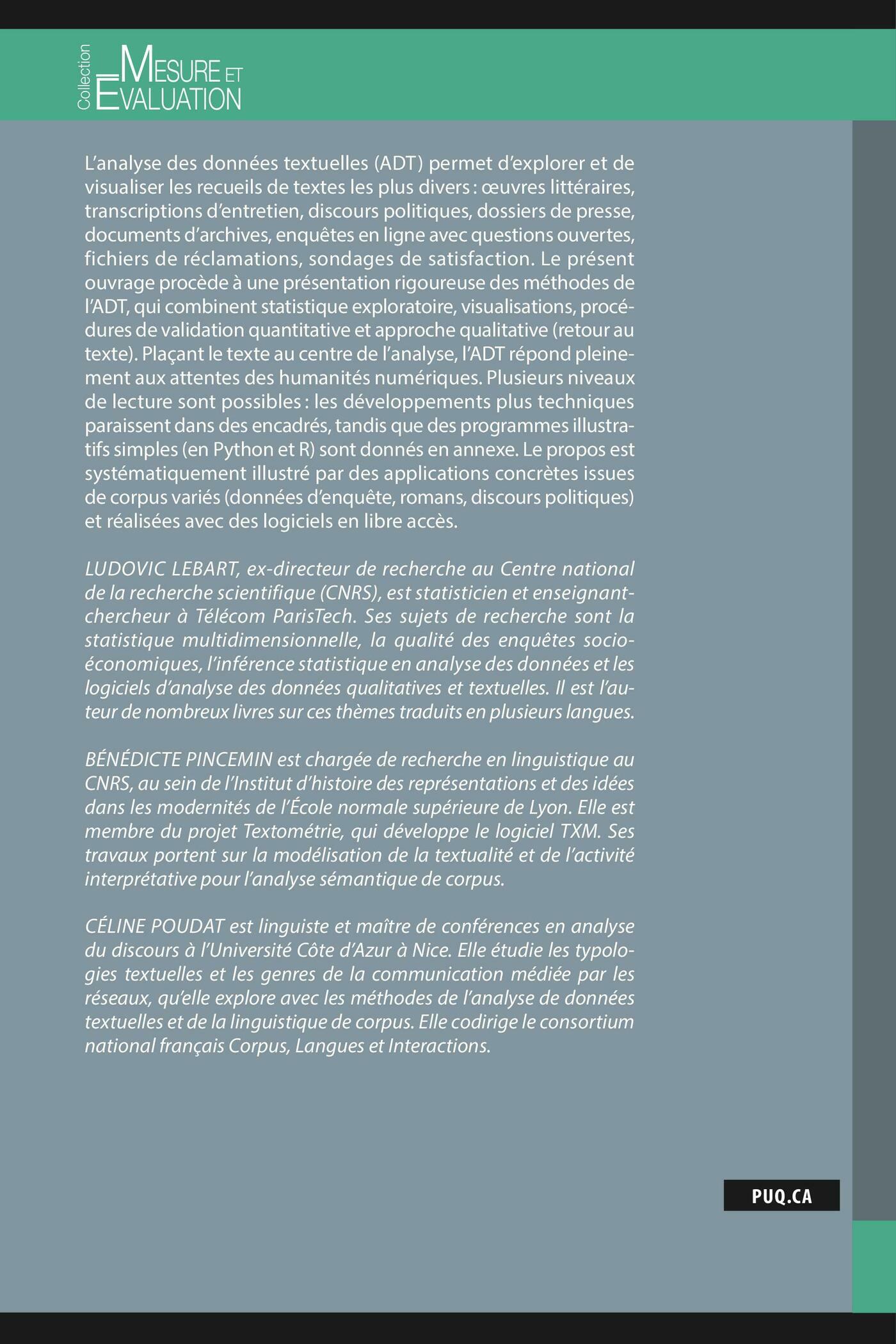 L’analyse des données textuelles (ADT) permet d’explorer et de visualiser les recueils de textes les plus divers : œuvres littéraires, transcriptions d’entretien, discours politiques, dossiers de presse, documents d’archives, enquêtes en ligne avec questions ouvertes, fichiers de réclamations, sondages de satisfaction. Le présent ouvrage procède à une présentation rigoureuse des méthodes de l’ADT, qui combinent statistique exploratoire, visualisations, procédures de validation quantitative et approche qualitative (retour au texte). Plaçant le texte au centre de l’analyse, l’ADT répond pleinement aux attentes des humanités numériques. Plusieurs niveaux de lecture sont possibles : les développements plus techniques paraissent dans des encadrés, tandis que des programmes illustratifs simples (en Python et R) sont donnés en annexe. Le propos est systématiquement illustré par des applications concrètes issues de corpus variés (données d’enquête, romans, discours politiques) et réalisées avec des logiciels en libre accès.Ludovic Lebart, ex-directeur de recherche au Centre national de la recherche scientifique (CNRS), est statisticien et enseignant- chercheur à Télécom ParisTech. Ses sujets de recherche sont la statistique multidimensionnelle, la qualité des enquêtes socio- économiques, l’inférence statistique en analyse des données et les logiciels d’analyse des données qualitatives et textuelles. Il est l’auteur de nombreux livres sur ces thèmes traduits en plusieurs langues.Bénédicte Pincemin est chargée de recherche en linguistique au CNRS, au sein de l’Institut d’histoire des représentations et des idées dans les modernités de l’École normale supérieure de Lyon. Elle est membre du projet Textométrie, qui développe le logiciel TXM. Ses travaux portent sur la modélisation de la textualité et de l’activité interprétative pour l’analyse sémantique de corpus.Céline Poudat est linguiste et maître de conférences en analyse du discours à l’Université Côte d’Azur à Nice. Elle étudie les typologies textuelles et les genres de la communication médiée par les réseaux, qu’elle explore avec les méthodes de l’analyse de données textuelles et de la linguistique de corpus. Elle codirige le consortium national français Corpus, Langues et Interactions.