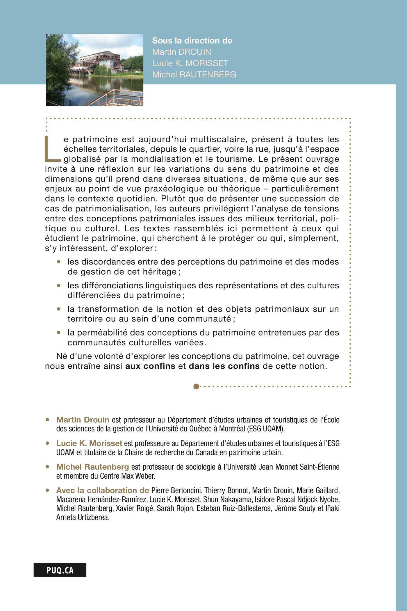 Le patrimoine est aujourd’hui multiscalaire, présent à toutes les échelles territoriales, depuis le quartier, voire la rue, jusqu’à l’espace globalisé par la mondialisation et le tourisme. Le présent ouvrage invite à une réflexion sur les variations du sens du patrimoine et des dimensions qu’il prend dans diverses situations, de même que sur ses enjeux au point de vue praxéologique ou théorique – particulièrement dans le contexte quotidien. Plutôt que de présenter une succession de cas de patrimonialisation, les auteurs privilégient l’analyse de tensions entre des conceptions patrimoniales issues des milieux territorial, politique ou culturel. Les textes rassemblés ici permettent à ceux qui étudient le patrimoine, qui cherchent à le protéger ou qui, simplement, s’y intéressent, d’explorer :