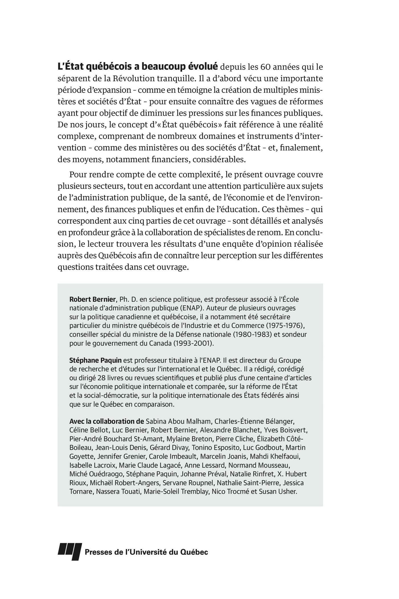 L’État québécois a beaucoup évolué depuis les 60 années qui le séparent de la Révolution tranquille. Il a d’abord vécu une importante période d’expansion – comme en témoigne la création de multiples ministères et sociétés d’État – pour ensuite connaître des vagues de réformes ayant pour objectif de diminuer les pressions sur les finances publiques. De nos jours, le concept d’« État québécois » fait référence à une réalité complexe, comprenant de nombreux domaines et instruments d’intervention – comme des ministères ou des sociétés d’État – et, finalement, des moyens, notamment financiers, considérables.Pour rendre compte de cette complexité, le présent ouvrage couvre plusieurs secteurs, tout en accordant une attention particulière aux sujets de l’administration publique, de la santé, de l’économie et de l’environnement, des finances publiques et enfin de l’éducation. Ces thèmes – qui correspondent aux cinq parties de cet ouvrage – sont détaillés et analysés en profondeur grâce à la collaboration de spécialistes de renom. En conclusion, le lecteur trouvera les résultats d’une enquête d’opinion réalisée auprès des Québécois afin de connaître leur perception sur les différentes questions traitées dans cet ouvrage.Robert Bernier, Ph. D. en science politique, est professeur associé à l’École nationale d’administration publique (ENAP). Auteur de plusieurs ouvrages sur la politique canadienne et québécoise, il a notamment été secrétaire particulier du ministre québécois de l’Industrie et du Commerce (1975-1976), conseiller spécial du ministre de la Défense nationale (1980-1983) et sondeur pour le gouvernement du Canada (1993-2001).Stéphane Paquin est professeur titulaire à l’ENAP. Il est directeur du Groupe de recherche et d’études sur l’international et le Québec. Il a rédigé, corédigé ou dirigé 28 livres ou revues scientifiques et publié plus d’une centaine d’articles sur l’économie politique internationale et comparée, sur la réforme de l’État et la social-démocratie, sur la politique internationale des États fédérés ainsi que sur le Québec en comparaison.