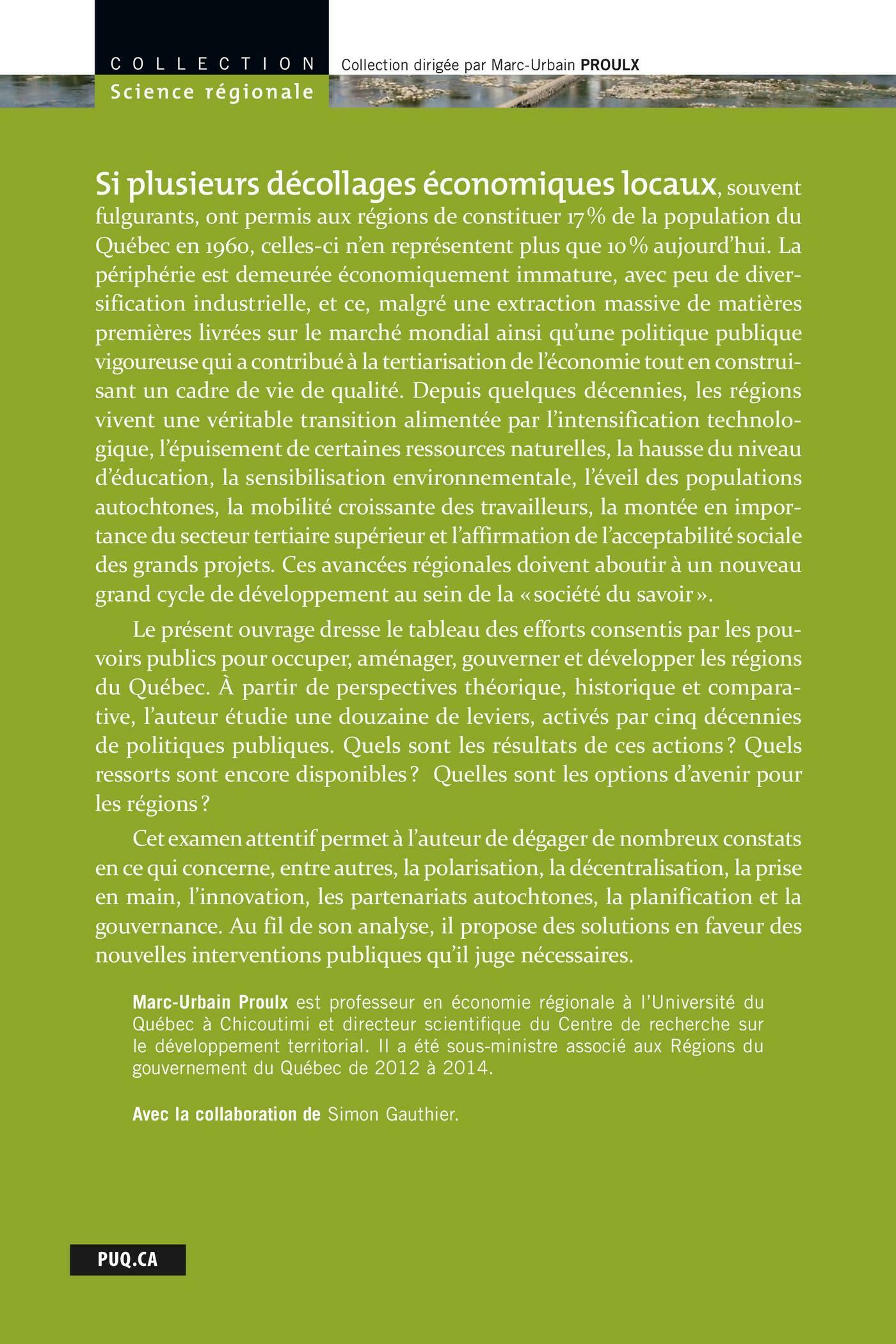 Si plusieurs décollages économiques locaux, souvent fulgurants, ont permis aux régions de constituer 17 % de la population du Québec en 1960, celles-ci n’en représentent plus que 10 % aujourd’hui. La périphérie est demeurée économiquement immature, avec peu de diversification industrielle, et ce, malgré une extraction massive de matières premières livrées sur le marché mondial ainsi qu’une politique publique vigoureuse qui a contribué à la tertiarisation de l’économie tout en construisant un cadre de vie de qualité. Depuis quelques décennies, les régions vivent une véritable transition alimentée par l’intensification technologique, l’épuisement de certaines ressources naturelles, la hausse du niveau d’éducation, la sensibilisation environnementale, l’éveil des populations autochtones, la mobilité croissante des travailleurs, la montée en importance du secteur tertiaire supérieur et l’affirmation de l’acceptabilité sociale des grands projets. Ces avancées régionales doivent aboutir à un nouveau grand cycle de développement au sein de la « société du savoir ».Le présent ouvrage dresse le tableau des efforts consentis par les pouvoirs publics pour occuper, aménager, gouverner et développer les régions du Québec. À partir de perspectives théorique, historique et comparative, l’auteur étudie une douzaine de leviers, activés par cinq décennies de politiques publiques. Quels sont les résultats de ces actions ? Quels ressorts sont encore disponibles ? Quelles sont les options d’avenir pour les régions ?Cet examen attentif permet à l’auteur de dégager de nombreux constats en ce qui concerne, entre autres, la polarisation, la décentralisation, la prise en main, l’innovation, les partenariats autochtones, la planification et la gouvernance. Au fil de son analyse, il propose des solutions en faveur des nouvelles interventions publiques qu’il juge nécessaires.Marc-Urbain Proulx est professeur en économie régionale à l’Université du Québec à Chicoutimi et directeur scientifique du Centre de recherche sur le développement territorial. Il a été sous-ministre associé aux Régions du gouvernement du Québec de 2012 à 2014.Avec la collaboration de Simon Gauthier.