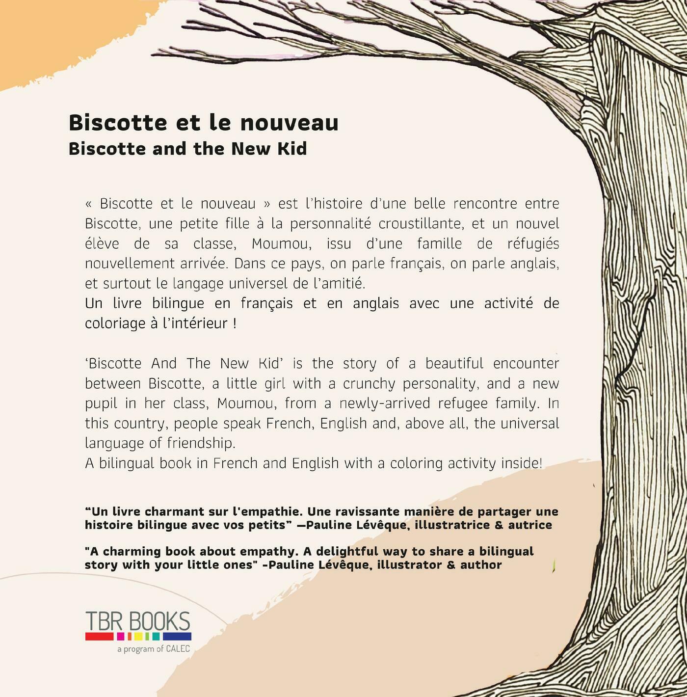 'Biscotte et le nouveau' est l'histoire d'une belle rencontre entre Biscotte, une petite fille à la personnalité croustillante, et un nouvel élève de sa classe, Moumou, issu d'une famille de réfugiés nouvellement arrivée. Dans ce pays, on parle français, on parle anglais, et surtout le langage universel de l'amitié. Un livre bilingue en français et en anglais avec une activité de coloriage à l'intérieur !'Biscotte And The New Kid' is the story of a beautiful encounter between Biscotte, a little girl with a crunchy personality, and a new pupil in her class, Moumou, from a newly-arrived refugee family. In this country, people speak French, English and, above all, the universal language of friendship. A bilingual book in French and English with a coloring activity inside!