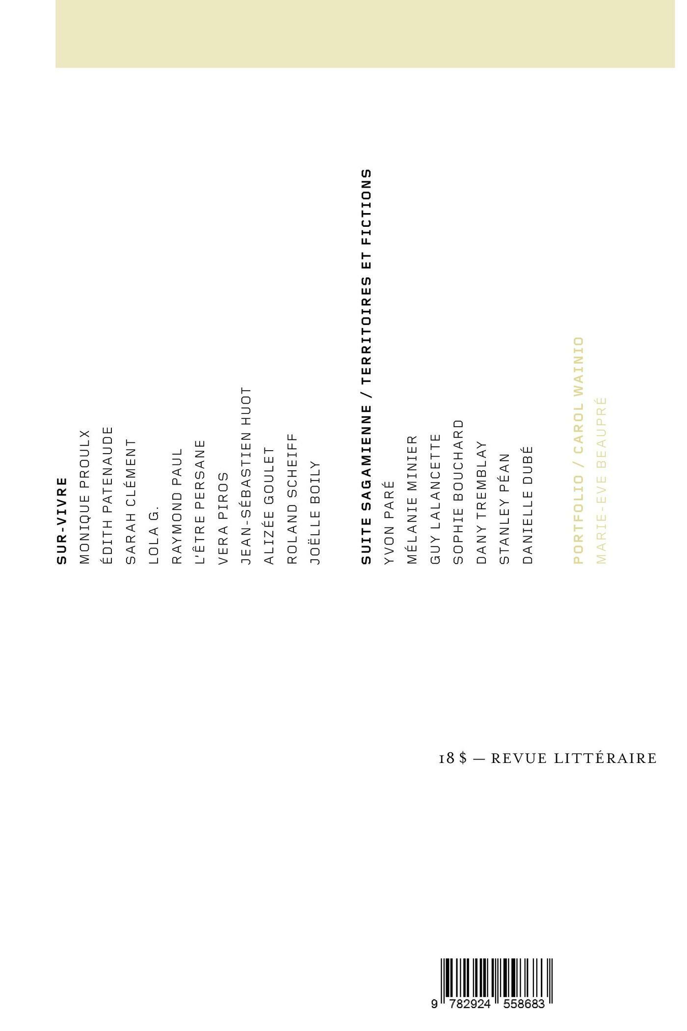 Alain Roy, Julie Mazzieri, Mathieu Bélisle, Julia Chamard-Bergeron, David Dorais, Simon Brousseau, Gabrielle Giasson-Dulude, Antonin Mireault-Plante, Mauricio Segura, Lucie Robert, Patrice Reytier, Marie-Anne Letarte, Heather O'Neill, Vincent Lambert, Geneviève Letarte, Michel Biron, Marie-Andrée Lamontage, Robert Levesque, Georges Privet, Sylvain David, Stanley Péan, Patrick Nicol