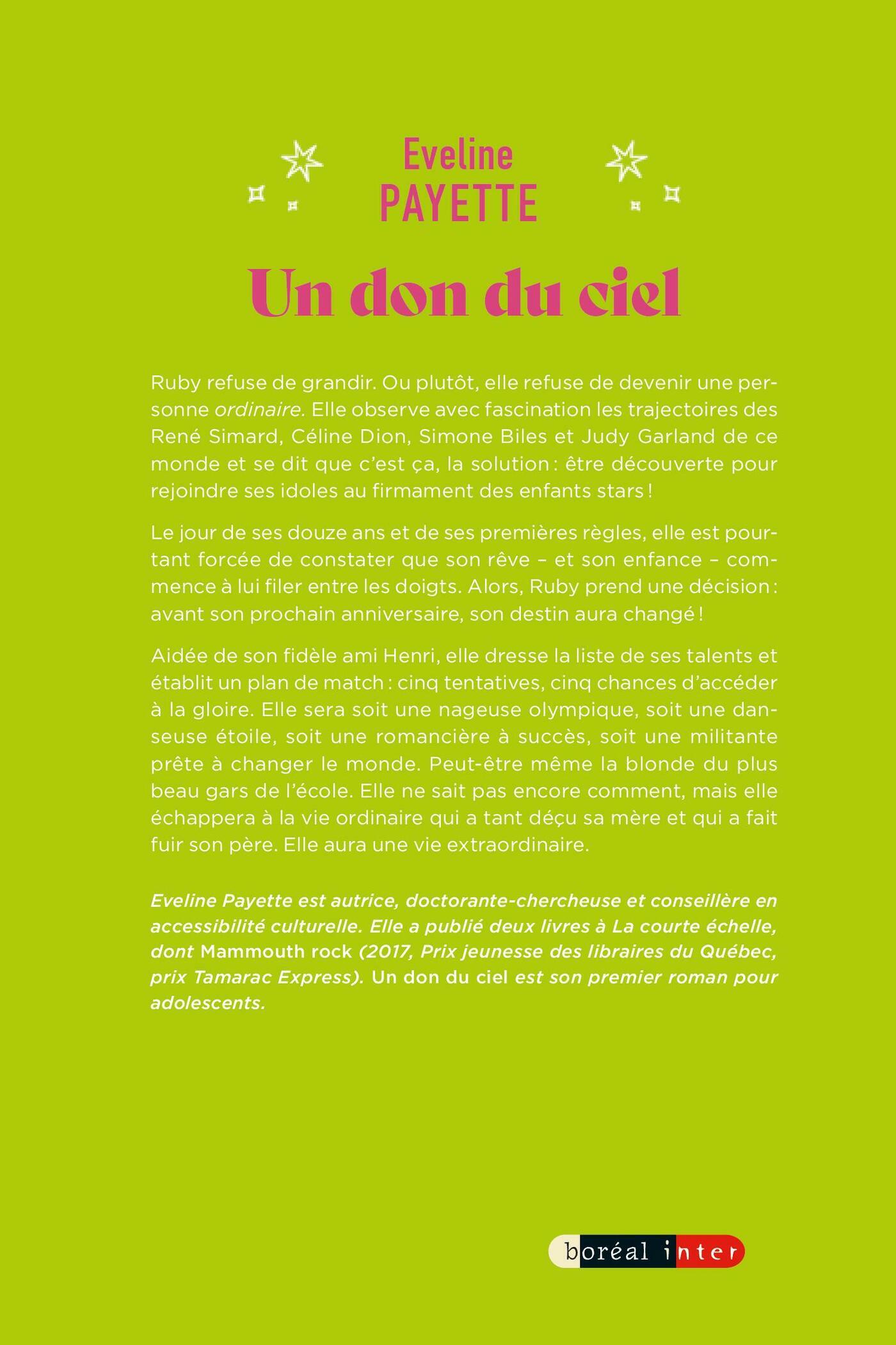 Aidée de son fidèle ami Henri, elle dresse la liste de ses talents et établit un plan de match aussi farfelu que pragmatique: cinq tentatives, cinq chances d’accéder à la gloire. Elle sera soit une nageuse olympique, soit une danseuse étoile; soit une romancière à succès, soit une militante prête à changer le monde. Peut-être même la blonde du plus beau gars de l’école. Elle ne sait pas encore comment, mais elle échappera à la vie ordinaire qui a tant déçu sa mère et qui a poussé son père à se détourner de sa famille. Elle aura une vie extraordinaire.