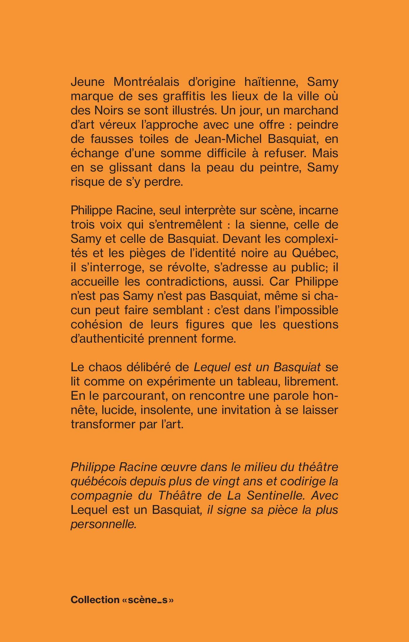 Jeune Montréalais d’origine haïtienne, Samy marque de ses graffitis les lieux de la ville où des Noirs se sont illustrés. Un jour, un marchand d’art véreux l’approche avec une offre : peindre de fausses toiles de Jean-Michel Basquiat, en échange d’une somme difficile à refuser. Mais en se glissant dans la peau du peintre, Samy risque de s’y perdre.Philippe Racine, seul interprète sur scène, incarne trois voix qui s’entremêlent : la sienne, celle de Samy et celle de Basquiat. Devant les complexités et les pièges de l’identité noire au Québec, il s’interroge, se révolte, s’adresse au public; il accueille les contradictions, aussi. Car Philippe n’est pas Samy n’est pas Basquiat, même si chacun peut faire semblant : c’est dans l’impossible cohésion de leurs figures que les questions d’authenticité prennent forme.Le chaos délibéré de Lequel est un Basquiat se lit comme on expérimente un tableau, librement. En le parcourant, on rencontre une parole honnête, lucide, insolente, une invitation à se laisser transformer par l’art.