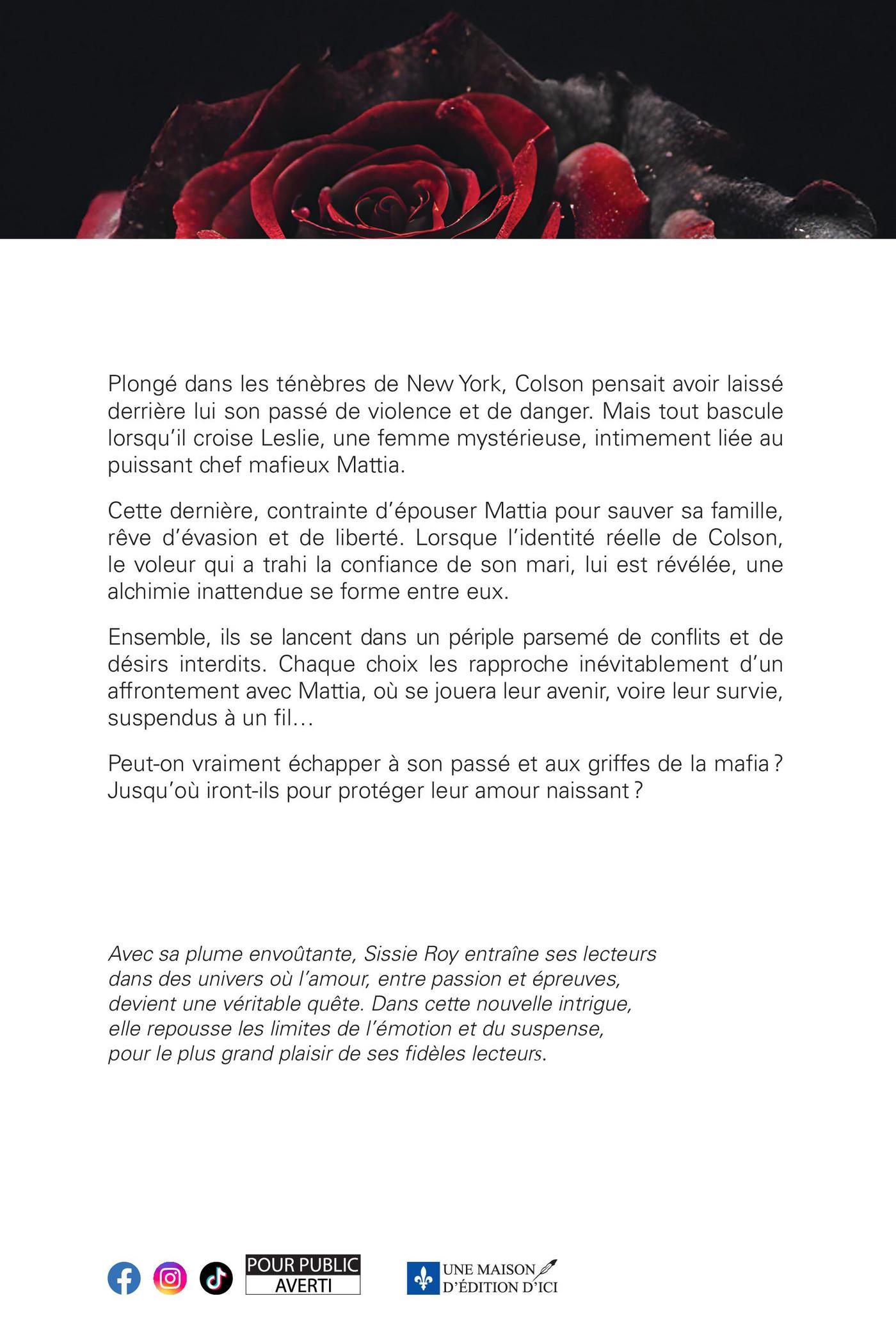 Plongé dans les ténèbres de New York, Colson pensait avoir laissé derrière lui son passé de violence et de danger. Mais tout bascule lorsqu’il croise Leslie, une femme mystérieuse, intimement liée au puissant chef mafieux Mattia. Cette dernière, contrainte d’épouser Mattia pour sauver sa famille, rêve d’évasion et de liberté. Lorsque l’identité réelle de Colson, le voleur qui a trahi la confiance de son mari, lui est révélée, une alchimie inattendue se forme entre eux. Ensemble, ils se lancent dans un périple parsemé de conflits et de désirs interdits. Chaque choix les rapproche inévitablement d’un affrontement avec Mattia, où se jouera leur avenir, voire leur survie, suspendus à un fil…Peut-on vraiment échapper à son passé et aux griffes de la mafia ? Jusqu’où iront-ils pour protéger leur amour naissant ?