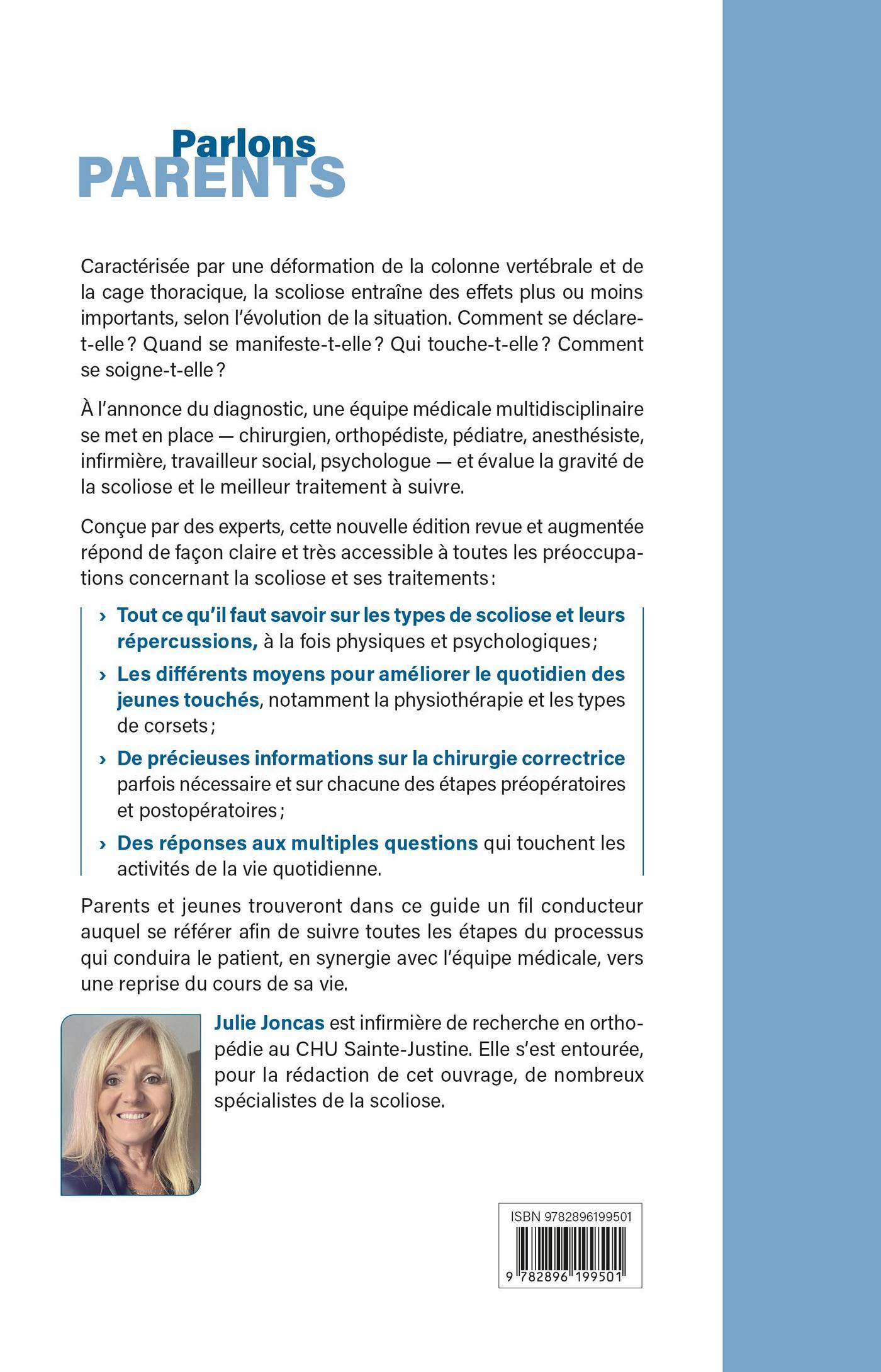 Caractérisée par une déformation de la colonne vertébrale et de la cage thoracique, la scoliose entraîne des effets plus ou moins importants, selon l’évolution de la situation. Comment se déclare-t-elle ? Quand se manifeste-t-elle ? Qui touche-t-elle ? Comment se soigne-t-elle ? À l’annonce du diagnostic, une équipe médicale multidisciplinaire se met en place - chirurgien, orthopédiste, pédiatre, anesthésiste, infirmière, travailleur social, psychologue – et évalue la gravité de la scoliose et le meilleur traitement à suivre.Conçu par des experts, cette nouvelle édition revue et augmentée répond de façon claire et très accessible à toutes les préoccupations concernant la scoliose et ses traitements :Tout ce qu’il faut savoir sur les types de scoliose et leurs répercussions, à la fois physiques et psychologiques ;Les différents moyens pour améliorer le quotidien des jeunes touchés, notamment la physiothérapie et les types de corsets ;De précieuses informations sur la chirurgie correctrice parfois nécessaire et sur chacune des étapes préopératoires et postopératoires ;Des réponses aux multiples questions qui touchent les activités de la vie quotidienne.Parents et jeunes trouveront dans ce guide un fil conducteur auquel se référer afin de suivre toutes les étapes du processus qui conduira le patient, en synergie avec l’équipe médicale, vers une reprise du cours de sa vie.