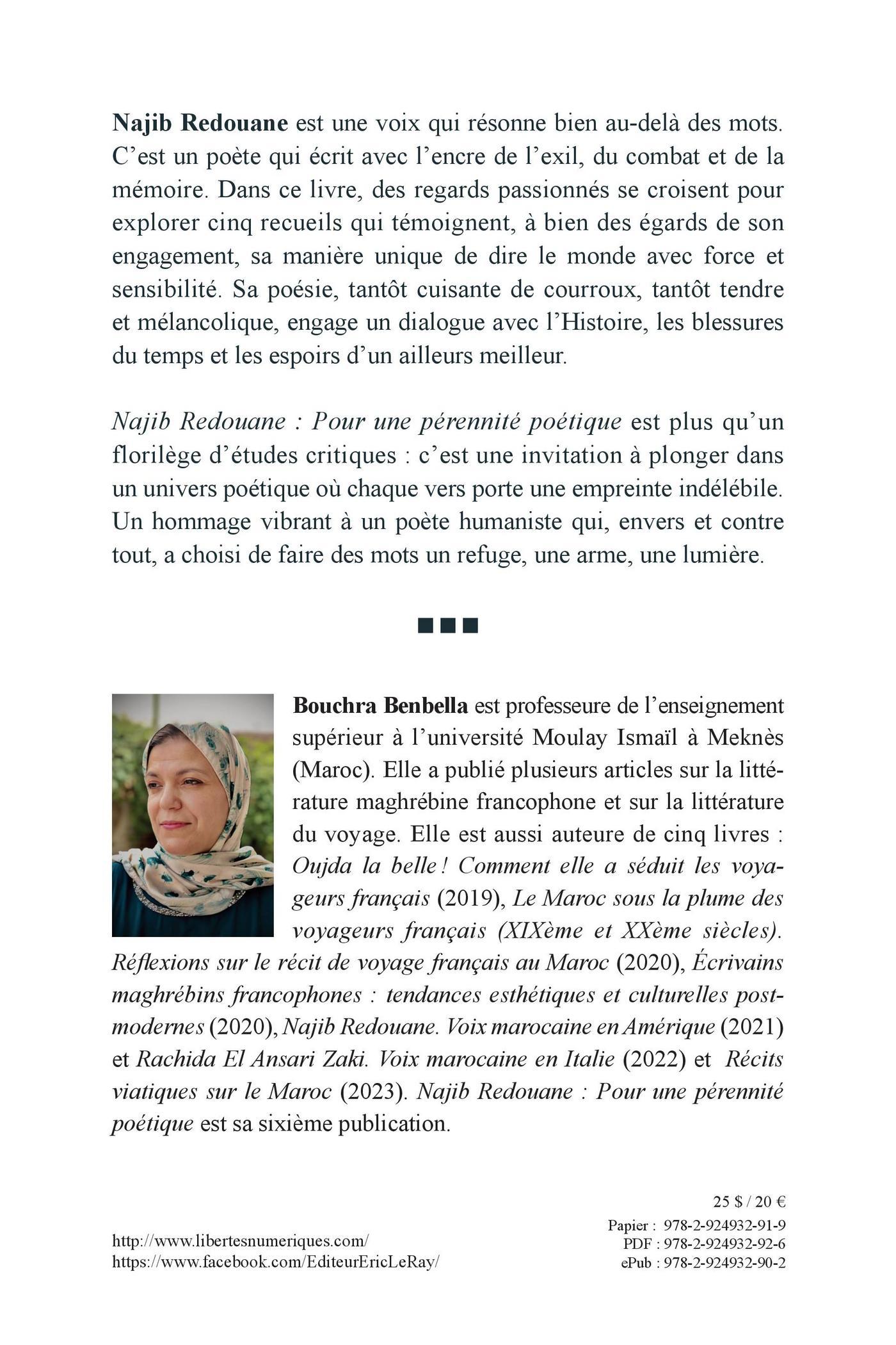 Najib Redouane est une voix qui résonne bien au-delà des mots. C’est un poète qui écrit avec l’encre de l’exil, du combat et de la mémoire. Dans ce livre, des regards passionnés se croisent pour explorer cinq recueils qui témoignent, à bien des égards de son engagement, sa manière unique de dire le monde avec force et sensibilité. Sa poésie, tantôt cuisante de courroux, tantôt tendre et mélancolique, engage un dialogue avec l’Histoire, les blessuresdu temps et les espoirs d’un ailleurs meilleur.Najib Redouane : Pour une pérennité poétique est plus qu’un florilège d’études critiques : c’est une invitation à plonger dans un univers poétique où chaque vers porte une empreinte indélébile. Un hommage vibrant à un poète humaniste qui, envers et contretout, a choisi de faire des mots un refuge, une arme, une lumièreBouchra Benbella est professeure de l’enseignement supérieur à l’université Moulay Ismaïl à Meknès (Maroc). Elle a publié plusieurs articles sur la littérature maghrébine francophone et sur la littérature du voyage. Elle est aussi auteure de cinq livres : Oujda la belle ! Comment elle a séduit les voyageurs français (2019), Le Maroc sous la plume des voyageurs français (XIX ème et XX ème siècles). Réflexions sur le récit de voyage français au Maroc (2020), Écrivains maghrébins francophones : tendances esthétiques et culturelles postmodernes (2020), Najib Redouane. Voix marocaine en Amérique (2021) et Rachida El Ansari Zaki. Voix marocaine en Italie (2022) et Récits viatiques sur le Maroc (2023). Najib Redouane : Pour une pérennité poétique est sa sixième publication.
