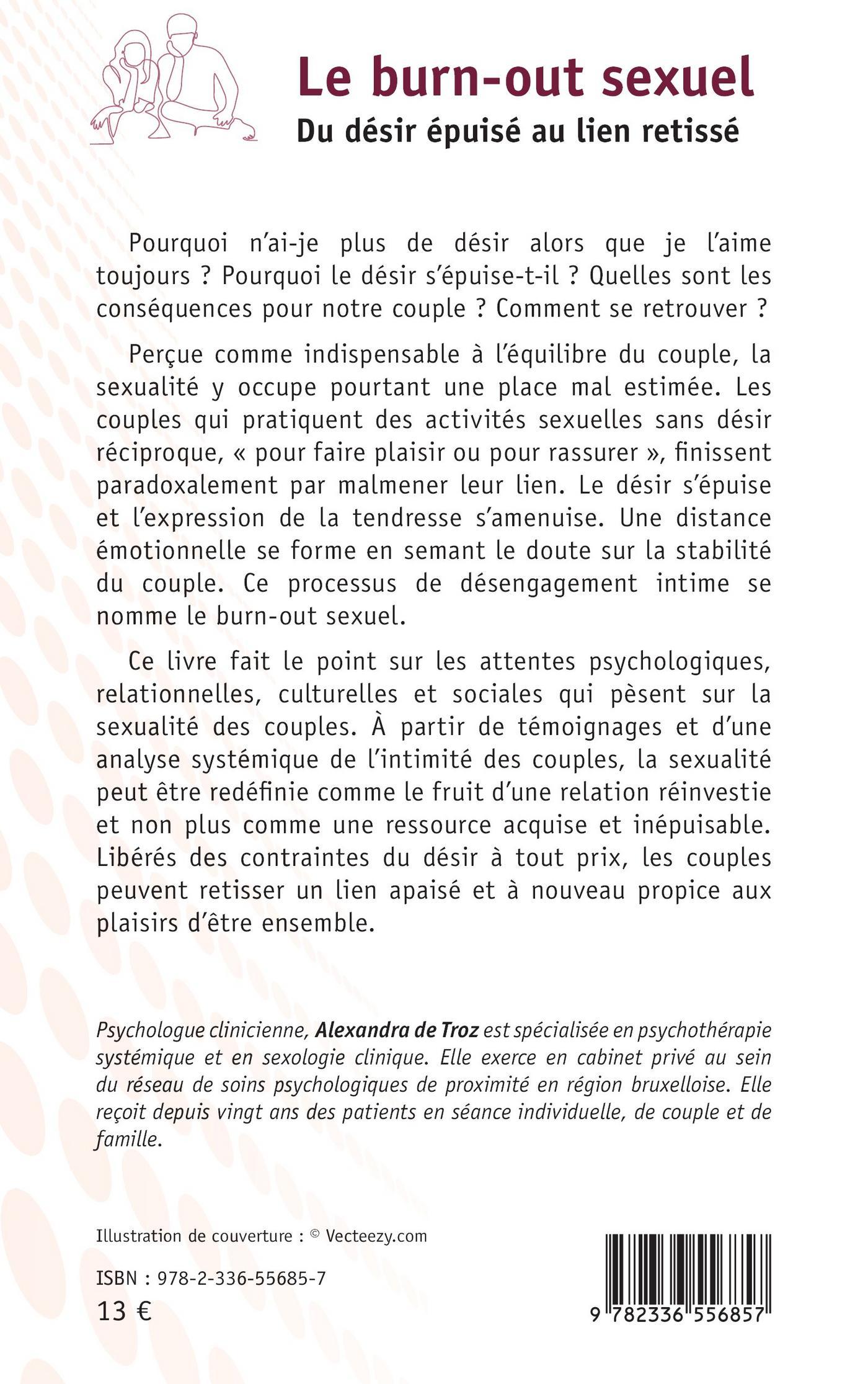 Perçue comme indispensable à l’équilibre du couple, la sexualité y occupe pourtant une place mal estimée. Les couples qui pratiquent des activités sexuelles sans désir réciproque, « pour faire plaisir ou pour rassurer », finissent paradoxalement par malmener leur lien. Le désir s’épuise et l’expression de la tendresse s’amenuise. Une distance émotionnelle se forme en semant le doute sur la stabilité du couple. Ce processus de désengagement intime se nomme le burn-out sexuel.