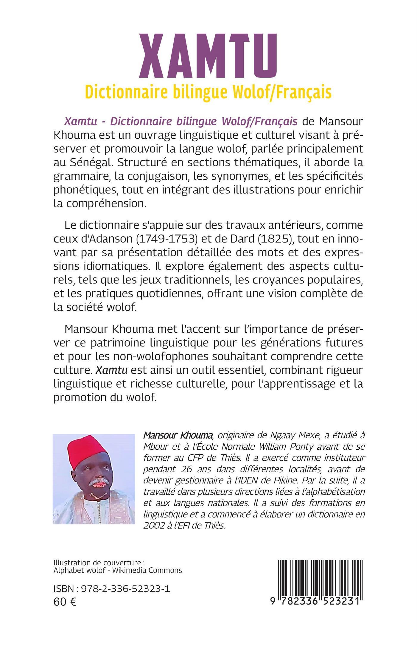Xamtu - Dictionnaire bilingue Wolof/Français de Mansour Khouma est un ouvrage linguistique et culturel visant à pré-server et promouvoir la langue wolof, parlée principalement au Sénégal. Structuré en sections thématiques, il aborde la grammaire, la conjugaison, les synonymes, et les spécifi cités phonétiques, tout en intégrant des illustrations pour enrichir la compréhension.