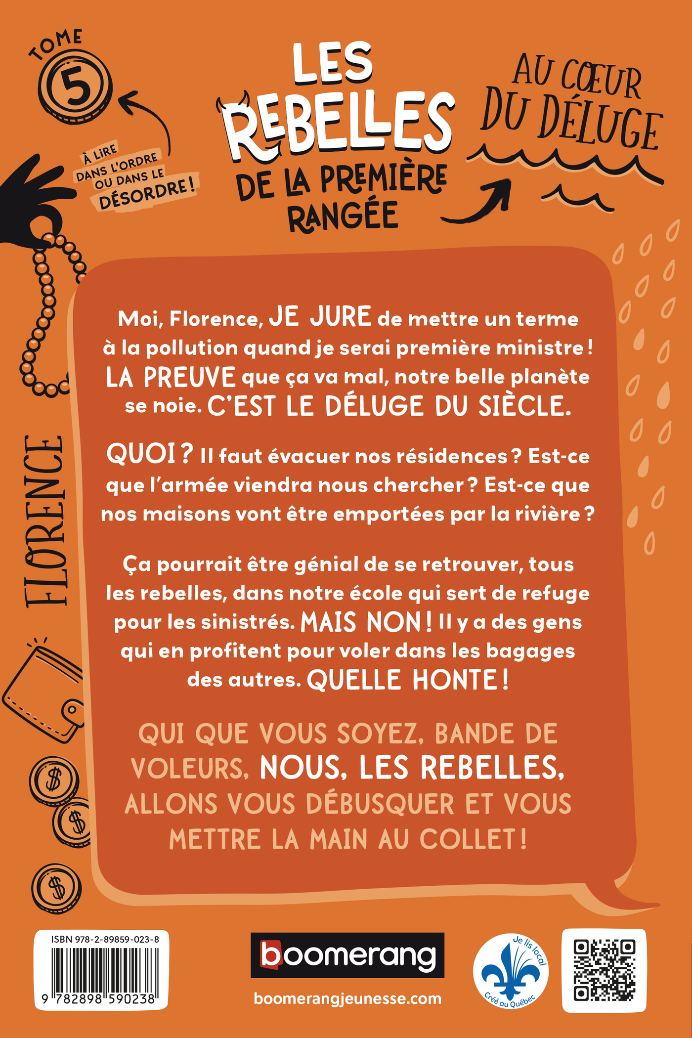 Moi, Florence, JE JURE de mettre un terme à la pollution quand je serai première ministre ! LA PREUVE que ça va mal, notre belle planète se noie. C’EST LE DÉLUGE DU SIÈCLE. QUOI ? Il faut évacuer nos résidences ? Est-ce que l’armée viendra nous chercher ? Est-ce que nos maisons vont être emportées par la rivière ? Ça pourrait être génial de se retrouver, tous les rebelles, dans notre école qui sert de refuge pour les sinistrés. MAIS NON ! Il y a des gens qui en profitent pour voler dans les bagages des autres. QUELLE HONTE ! QUI QUE VOUS SOYEZ, BANDE DE VOLEURS, NOUS, LES REBELLES, ALLONS VOUS DÉBUSQUER ET VOUS METTRE LA MAIN AU COLLET !