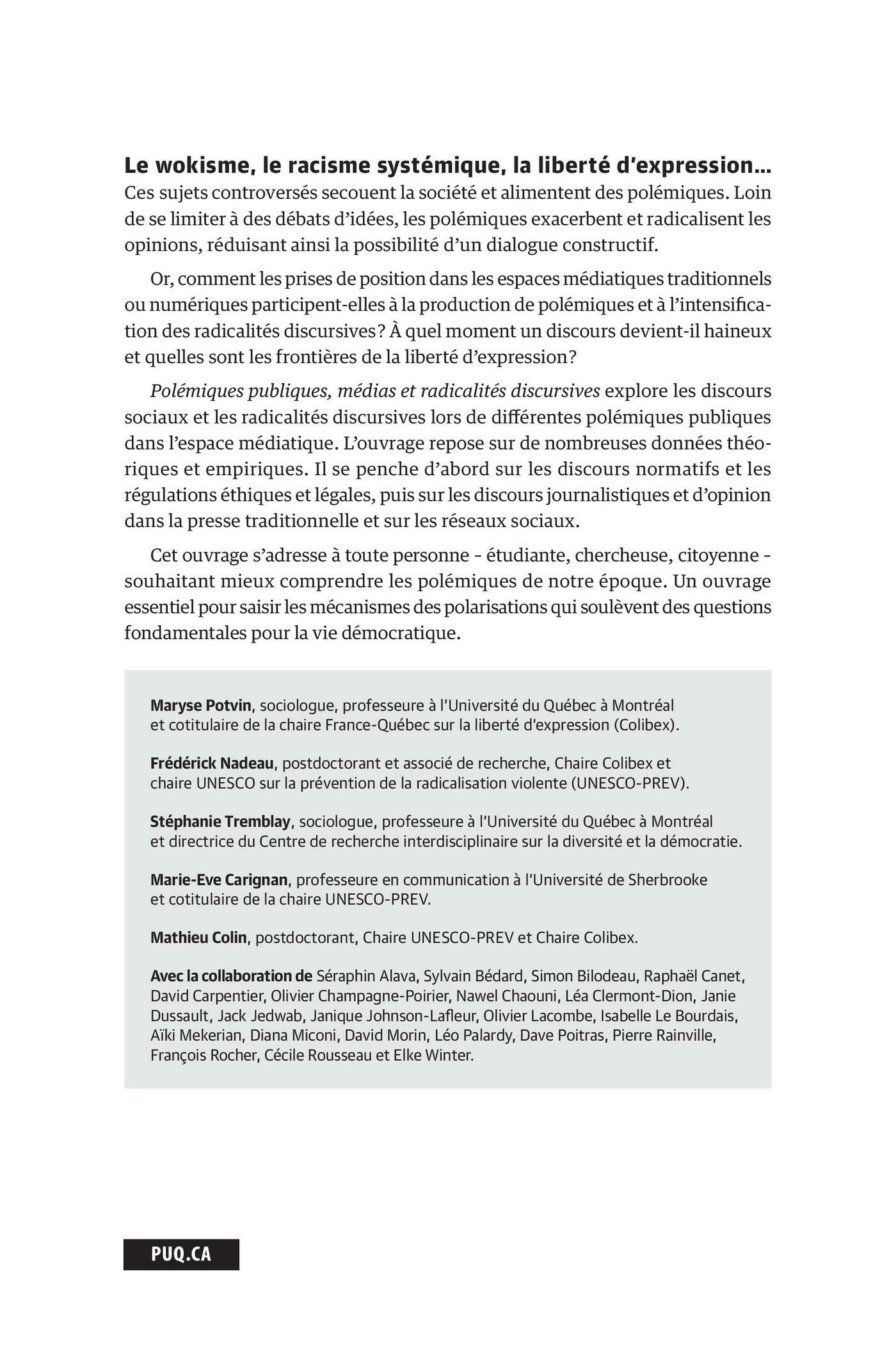 Cet ouvrage s’adresse à toute personne – étudiante, chercheuse, citoyenne – souhaitant mieux comprendre les polémiques de notre époque. Un ouvrage essentiel pour saisir les mécanismes des polarisations qui soulèvent des questions fondamentales pour la vie démocratique.