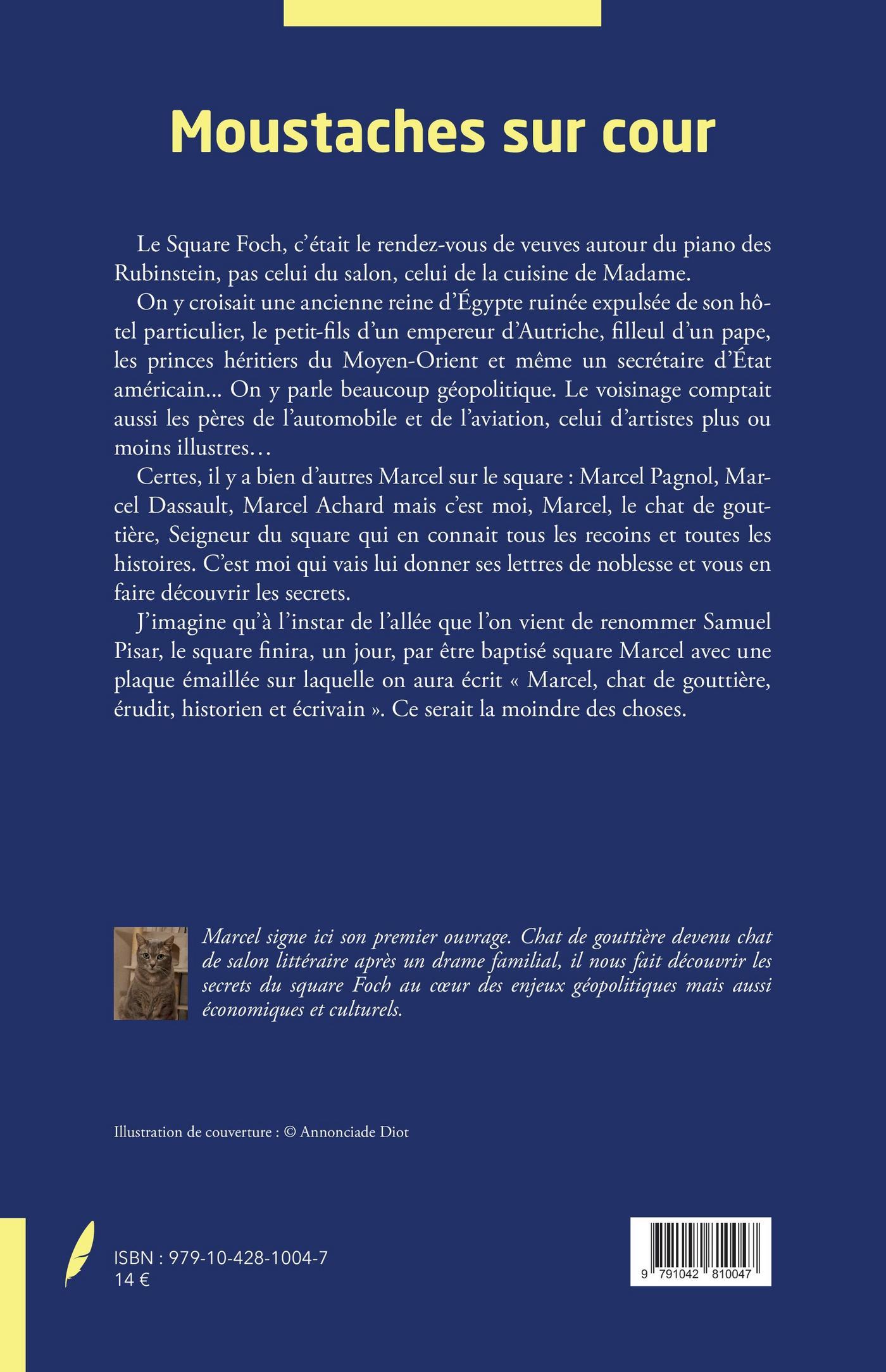 Certes, il y a bien d’autres Marcel sur le square : Marcel Pagnol, Marcel Dassault, Marcel Achard mais c’est moi, Marcel, le chat de gouttière, Seigneur du square qui en connait tous les recoins et toutes les histoires. C’est moi qui vais lui donner ses lettres de noblesse et vous en faire découvrir les secrets.