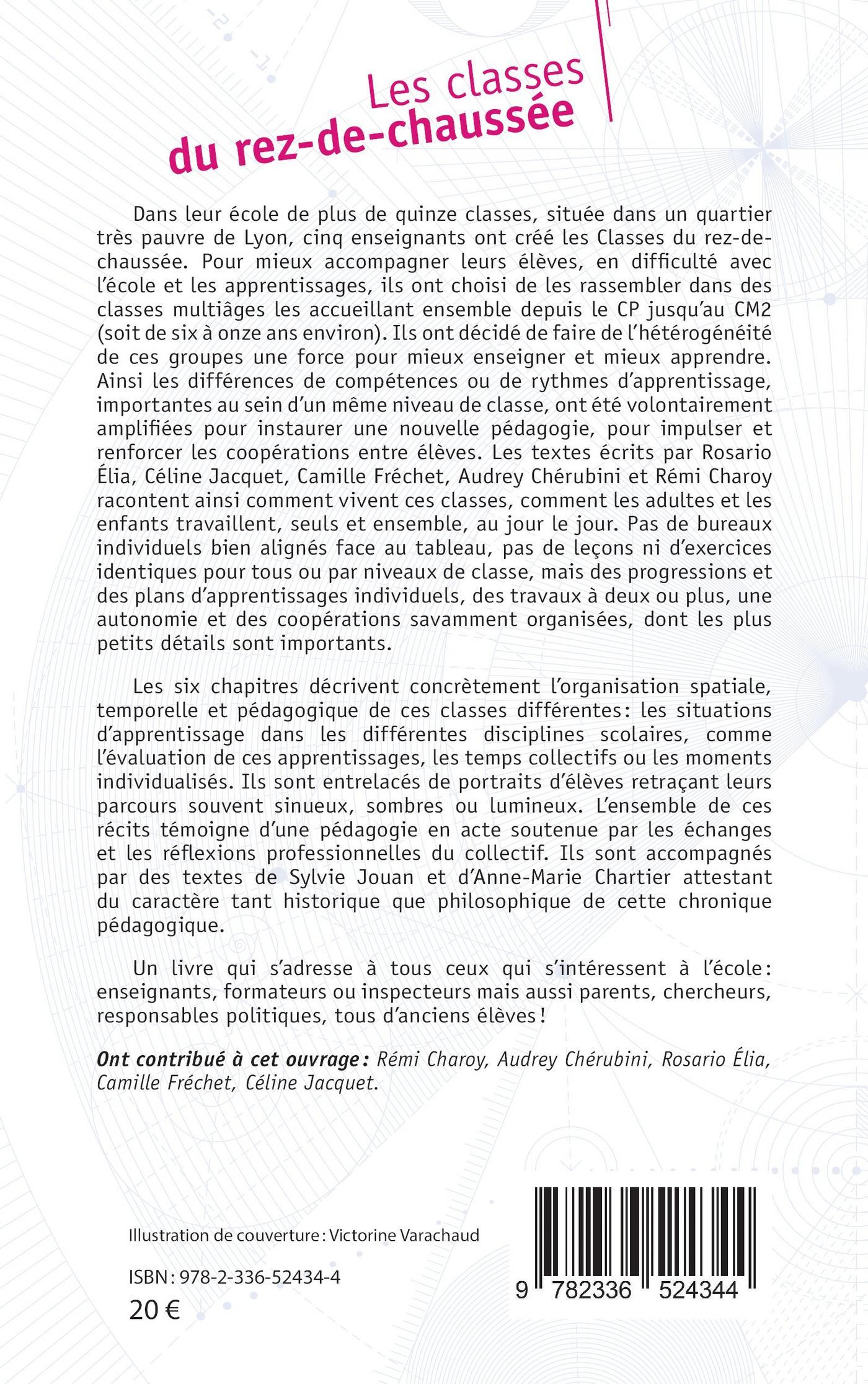 Dans leur école de plus de quinze classes, située dans un quartier très pauvre de Lyon, cinq enseignants ont créé les classes du rez-de-chaussée. Pour mieux accompagner leurs élèves, en difficulté avec l’école et les apprentissages, ils ont choisi de les rassembler dans des classes multiâges les accueillant ensemble depuis le CP jusqu’au CM2 (soit de six à onze ans environ). Ils ont décidé de faire de l’hétérogénéité de ces groupes une force pour mieux enseigner et mieux apprendre. Ainsi les différences de compétences ou de rythmes d’apprentissage, importantes au sein d’un même niveau de classe, ont été volontairement amplifiées pour instaurer une nouvelle pédagogie, pour impulser et renforcer les coopérations entre élèves. Les textes écrits par Rosario Élia, Céline Jacquet, Camille Fréchet, Audrey Chérubini et Rémi Charoy racontent ainsi comment vivent ces classes, comment les adultes et les enfants travaillent, seuls et ensemble, au jour le jour. Pas de bureaux individuels bien alignés face au tableau, pas de leçons ni d’exercices identiques pour tous ou par niveaux de classe, mais des progressions et des plans d’apprentissages individuels, des travaux à deux ou plus, une autonomie et des coopérations savamment organisées, dont les plus petits détails sont importants.