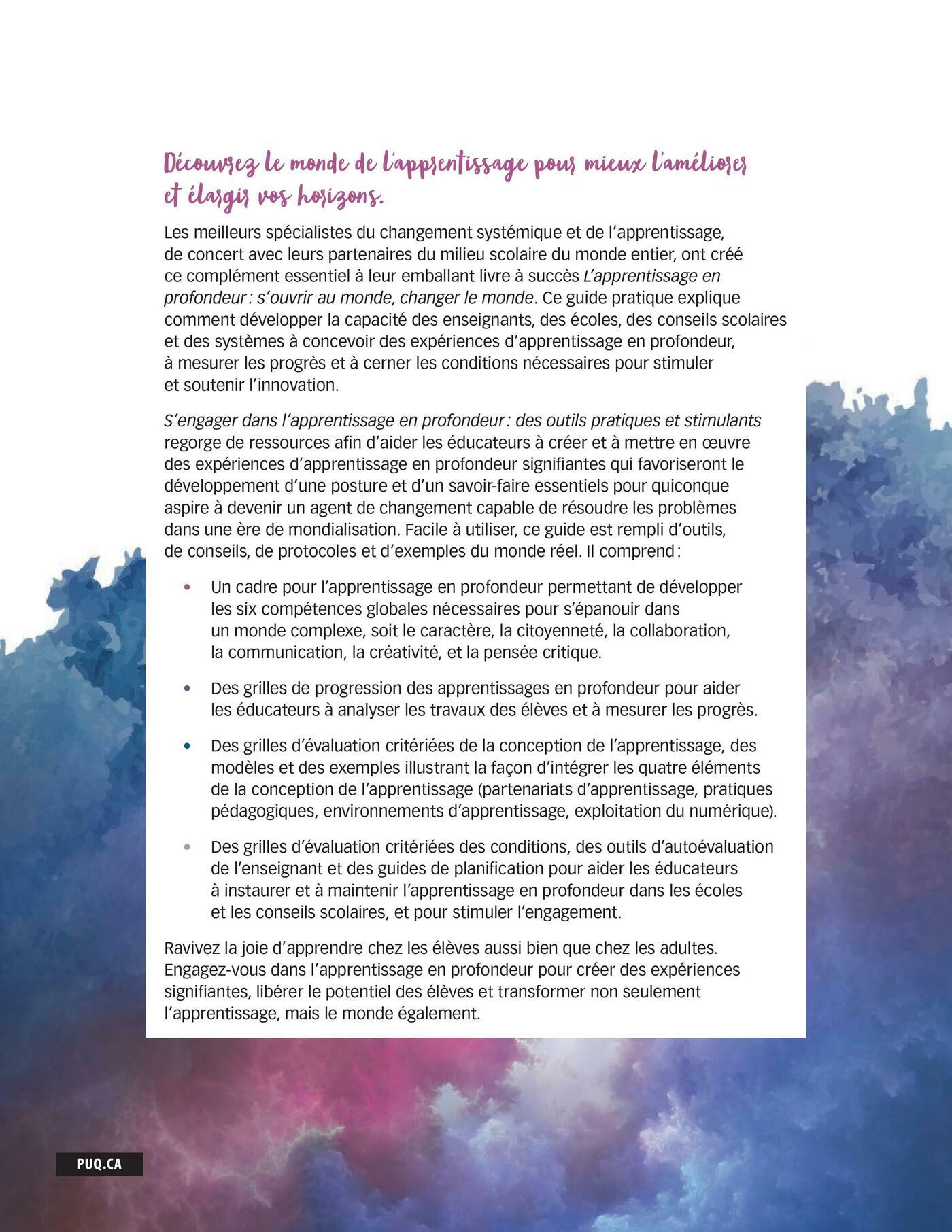 Découvrez le monde de l’apprentissage pour mieux l’améliorer et élargir vos horizons.Les meilleurs spécialistes du changement systémique et de l’apprentissage, de concert avec leurs partenaires du milieu scolaire du monde entier, ont créé ce complément essentiel à leur emballant livre à succès L’apprentissage en profondeur : s’ouvrir au monde, changer le monde. Ce guide pratique explique comment développer la capacité des enseignants, des écoles, des conseils scolaires et des systèmes à concevoir des expériences d’apprentissage en profondeur, à mesurer les progrès et à cerner les conditions nécessaires pour stimuler et soutenir l’innovation.S’engager dans l’apprentissage en profondeur : des outils pratiques et stimulants regorge de ressources afin d’aider les éducateurs à créer et à mettre en œuvre des expériences d’apprentissage en profondeur signifiantes qui favoriseront le développement d’une posture et d’un savoir-faire essentiels pour quiconque aspire à devenir un agent de changement capable de résoudre les problèmes dans une ère de mondialisation. Facile à utiliser, ce guide est rempli d’outils, de conseils, de protocoles et d’exemples du monde réel. Il comprend :Un cadre pour l’apprentissage en profondeur permettant de développer les six compétences globales nécessaires pour s’épanouir dans un monde complexe, soit le caractère, la citoyenneté, la collaboration, la communication, la créativité, et la pensée critique.Des grilles de progression des apprentissages en profondeur pour aider les éducateurs à analyser les travaux des élèves et à mesurer les progrès.Des grilles d’évaluation critériées de la conception de l’apprentissage, des modèles et des exemples illustrant la façon d’intégrer les quatre éléments de la conception de l’apprentissage (partenariats d’apprentissage, pratiques pédagogiques, environnements d’apprentissage, exploitation du numérique).Des grilles d’évaluation critériées des conditions, des outils d’autoévaluation de l’enseignant et des guides de planification pour aider les éducateurs à instaurer et à maintenir l’apprentissage en profondeur dans les écoles et les conseils scolaires, et pour stimuler l’engagement.Ravivez la joie d’apprendre chez les élèves aussi bien que chez les adultes. Engagez-vous dans l’apprentissage en profondeur pour créer des expériences signifiantes, libérer le potentiel des élèves et transformer non seulement l’apprentissage, mais le monde également.