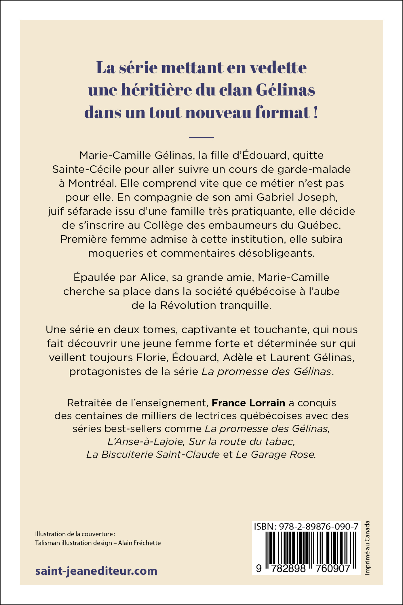 La série mettant en vedette une héritière du clan Gélinas dans un tout nouveau format!Marie-Camille Gélinas, la fille d’Édouard, quitte Sainte-Cécile pour aller suivre un cours de garde-malade à Montréal. Elle comprend vite que ce métier n’est pas pour elle. En compagnie de son ami Gabriel Joseph, juif séfarade issu d’une famille très pratiquante, elle décide alors de s’inscrire au Collège des embaumeurs du Québec. Première femme admise à cette institution, elle subira moqueries et commentaires désobligeants.Épaulée par Alice, sa grande amie, Marie-Camille cherche sa place dans la société québécoise à l’aube de la Révolution tranquille. Une série en deux tomes, captivante et touchante, sur les choix de vie, la persévérance et la résilience qui nous fait découvrir une jeune femme forte et déterminée sur qui veillent toujours Florie, Édouard, Adèle et Laurent Gélinas, protagonistes de la série La promesse des Gélinas.