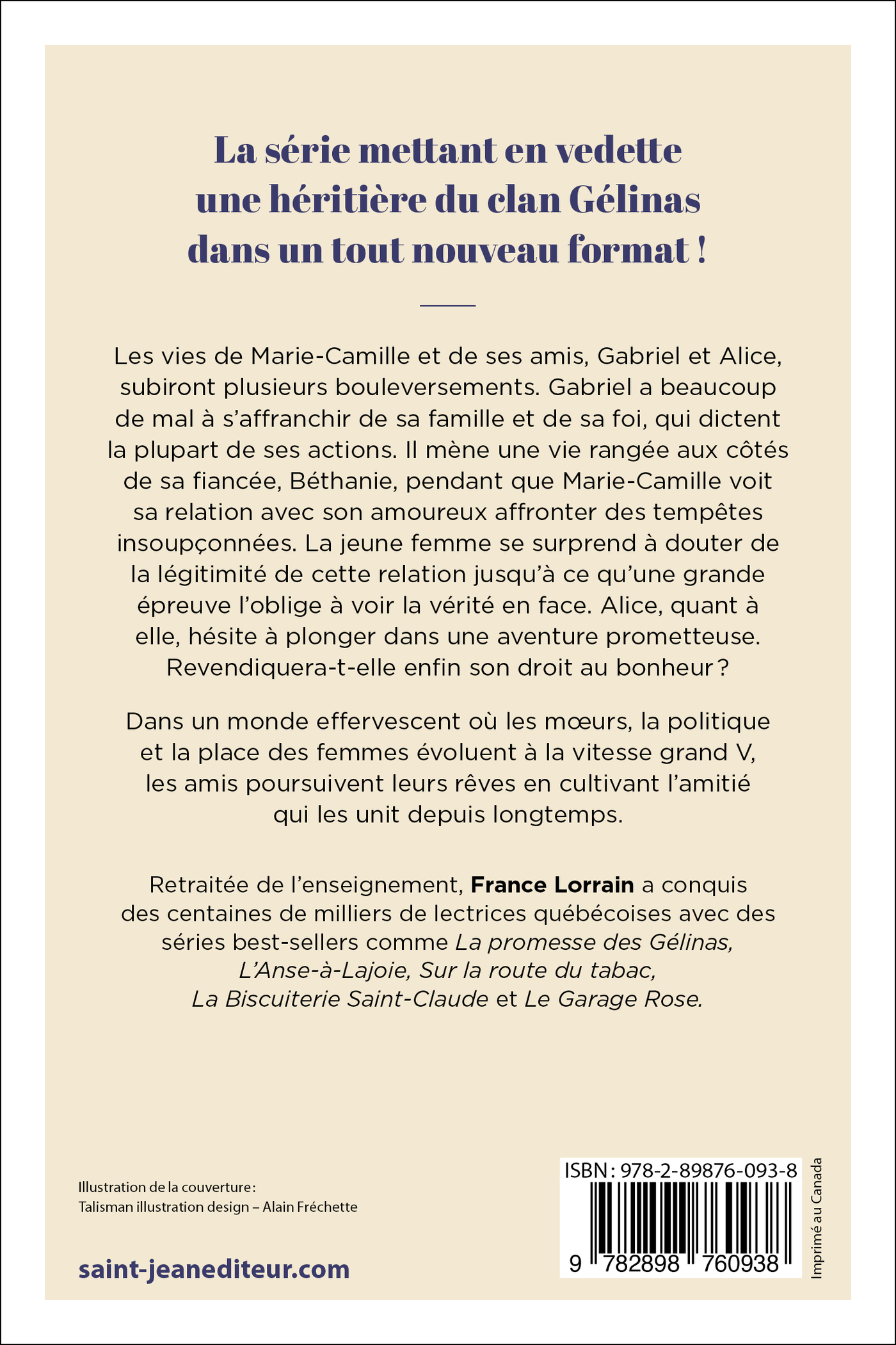 La série mettant en vedette une héritière du clan Gélinas dans un tout nouveau format!La vie de Marie-Camille et de ses amis, Gabriel et Alice, subira plusieurs bouleversements. Gabriel a beaucoup de mal à s’affranchir de sa famille et de sa foi, qui dictent la plupart de ses actions. Il mène une vie rangée aux côtés de sa fiancée, Béthanie, pendant que Marie-Camille voit sa relation avec son amoureux affronter des tempêtes insoupçonnées; la jeune femme se surprend même à douter de la légitimité de cette relation jusqu’à ce qu’une grande épreuve l’oblige à voir la vérité en face. Alice, quant à elle, hésite à plonger dans une aventure prometteuse. Revendiquera-t-elle enfin son droit au bonheur? Dans un monde effervescent où les mœurs, la politique et la place des femmes évoluent à la vitesse grand V, les amis poursuivent leurs rêves en cultivant l’amitié qui les unit depuis longtemps.
