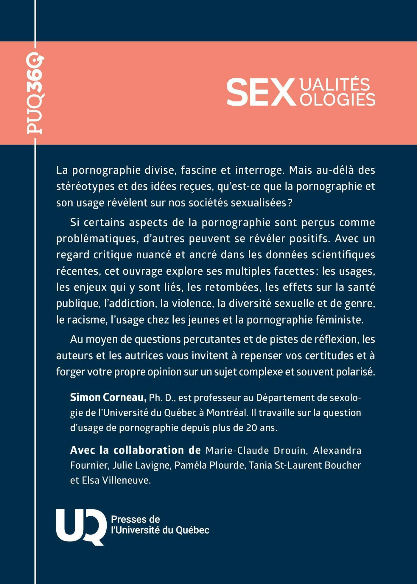 Si certains aspects de la pornographie sont perçus comme problématiques, d’autres peuvent se révéler positifs. Avec un regard critique nuancé et ancré dans les données scientifiques récentes, cet ouvrage explore ses multiples facettes : les usages, les enjeux qui y sont liés, les retombées, les effets sur la santé publique, l’addiction, la violence, la diversité sexuelle et de genre, le racisme, l’usage chez les jeunes et la pornographie féministe.