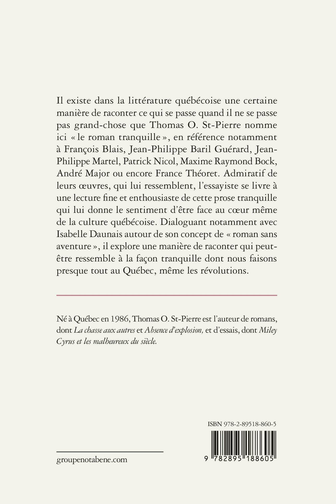 Il existe dans la littérature québécoise une certaine manière de raconter ce qui se passe quand il ne se passe pas grand-chose que Thomas O. St-Pierre nomme ici « le roman tranquille », en référence notamment à François Blais, Jean-Philippe Baril Guérard, Jean-Philippe Martel, Patrick Nicol, Maxime Raymond Bock, André Major ou encore France Théoret. Admiratif de leurs œuvres, qui lui ressemblent, l’essayiste se livre à une lecture fine et enthousiaste de cette prose tranquille qui lui donne le sentiment d’être face au coeur même de la culturequébécoise. Dialoguant notamment avec Isabelle Daunais autour de son concept de « roman sans aventure », il explore une manière de raconter qui peut-être ressemble à la façon tranquille dont nous faisons presque tout au Québec, même les révolutions.