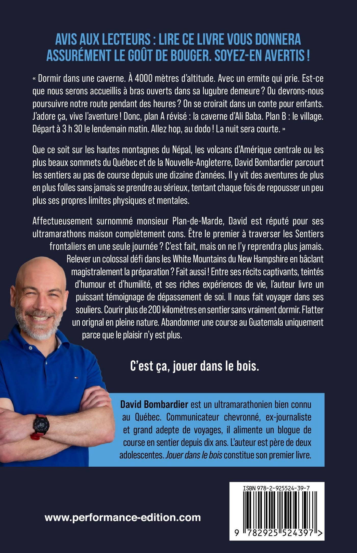Avis aux lecteurs : lire ce livre vous donnera assurément le goût de bouger. Soyez-en avertis!« Dormir dans une caverne. À 4000 mètres d’altitude. Avec un ermite qui prie. Est-ce que nous serons accueillis à bras ouverts dans sa lugubre demeure? Ou devrons-nous poursuivre notre route pendant des heures? On se croirait dans un conte pour enfants. J’adore ça, vive l’aventure! Donc, plan A révisé : la caverne d’Ali Baba. Plan B : le village. Départ à 3 h 30 le lendemain matin. Allez hop, au dodo! La nuit sera courte. »Que ce soit sur les hautes montagnes du Népal, les volcans d’Amérique centrale ou les plus beaux sommets du Québec et de la Nouvelle-Angleterre, David Bombardier parcourt les sentiers au pas de course depuis une dizaine d’années. Il y vit des aventures de plus en plus folles sans jamais se prendre au sérieux, tentant chaque fois de repousser un peu plus ses propres limites physiques et mentales.Affectueusement surnommé monsieur Plan-de-Marde, David est réputé pour ses ultramarathons maison complètement cons. Être le premier à traverser les Sentiers frontaliers en une seule journée ? C’est fait, mais on ne l’y reprendra plus jamais. Relever un colossal défi dans les White Mountains du New Hampshire en bâclant magistralement la préparation ? Fait aussi ! Entre ses récits captivants, teintés d’humour et d’humilité, et ses riches expériences de vie, l’auteur livre un puissant témoignage de dépassement de soi. Il nous fait voyager, dans sessouliers. Courir plus de 200 kilomètres en sentier sans vraiment dormir. Flatter un orignal en pleine nature. Abandonner une course au Guatemalauniquement parce que le plaisir n’y est plus. C’est ça, Jouer dans le bois.
