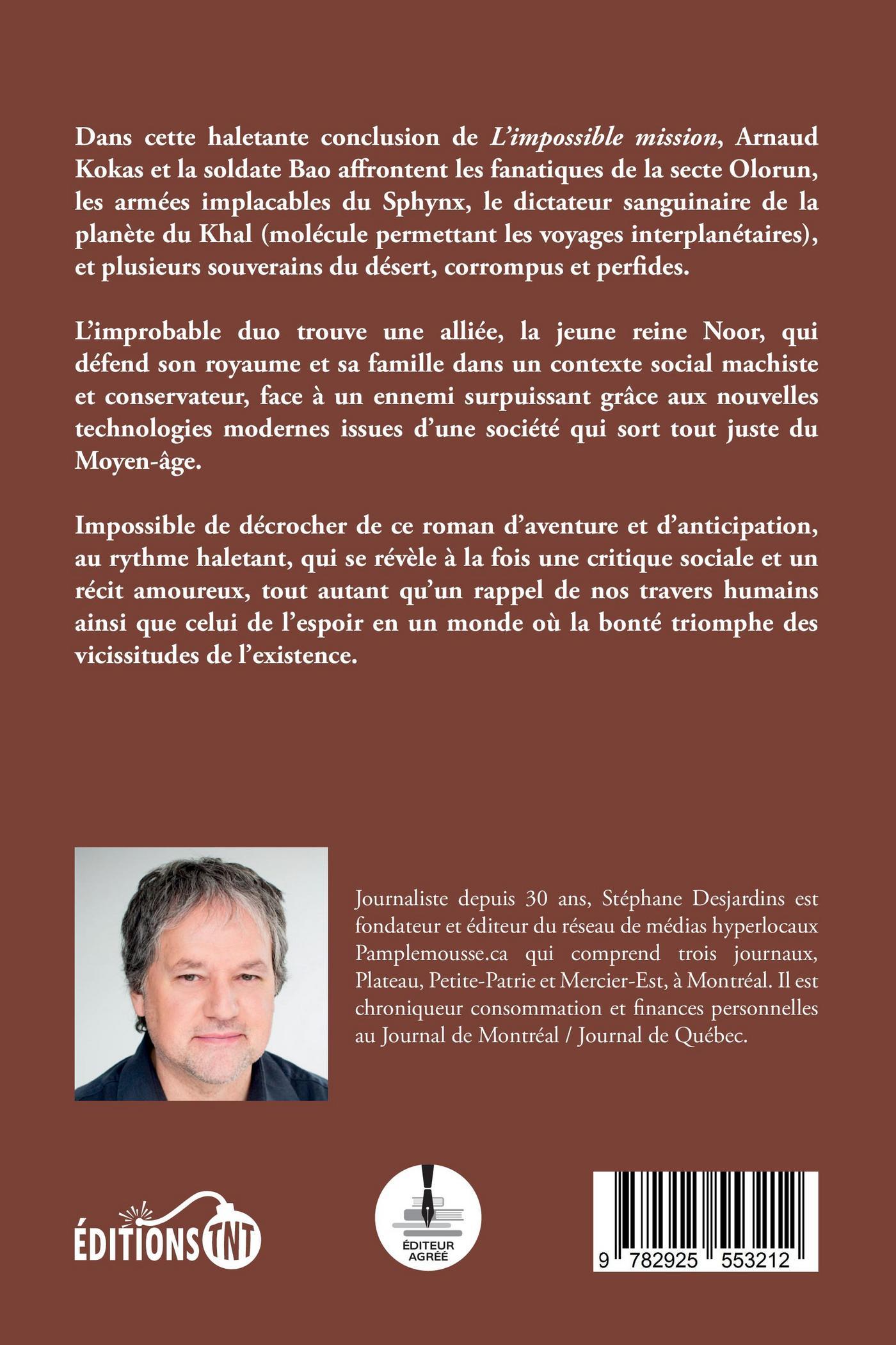 Dans cette haletante conclusion de L’impossible mission, Arnaud Kokas et la soldate Bao affrontent les fanatiques de la secte Olorun, les armées implacables du Sphynx, le dictateur sanguinaire de la planète du Khal (molécule permettant les voyages interplanétaires), et plusieurs souverains du désert, corrompus et perfides. L’improbable duo trouve une alliée, la jeune reine Noor, qui défend son royaume et sa famille dans un contexte social machiste et conservateur, face à un ennemi surpuissant grâce aux nouvelles technologies modernes issues d’une société qui sort tout juste du Moyen-âge. Impossible de décrocher de ce roman d’aventure et d’anticipation, au rythme haletant, qui se révèle à la fois une critique sociale et un récit amoureux, tout autant qu’un rappel de nos travers humains ainsi que celui de l’espoir en un monde où la bonté triomphe des vicissitudes de l’existence.