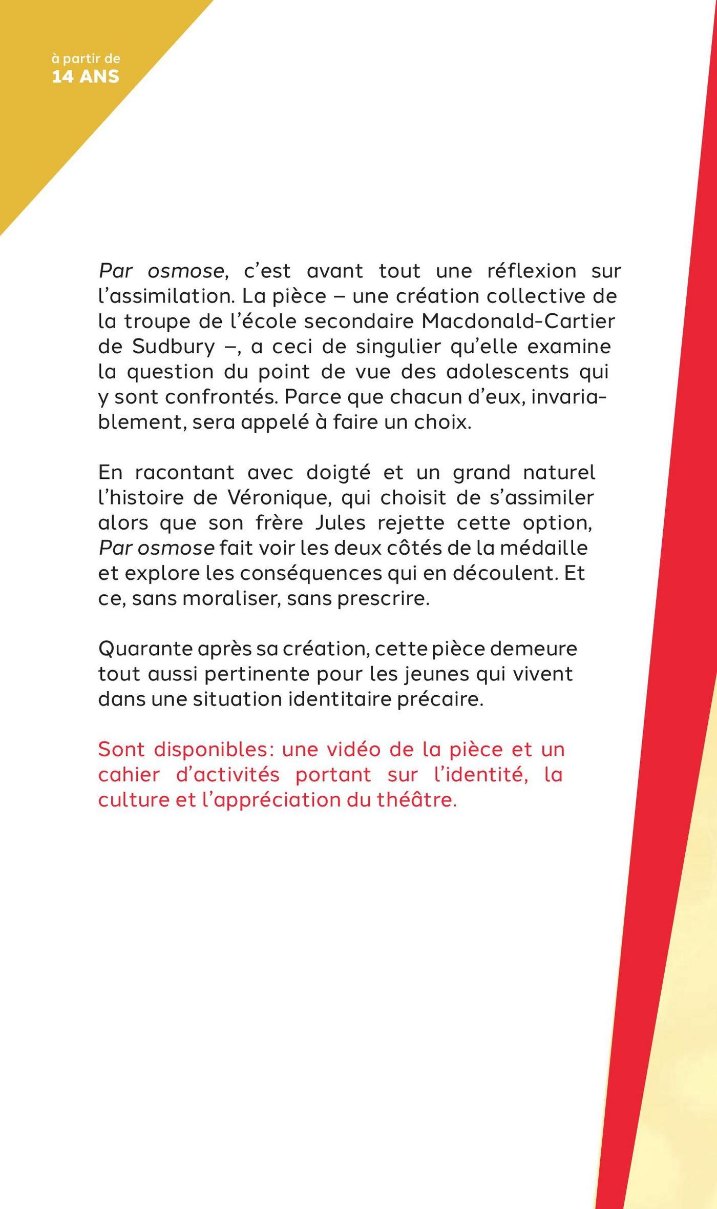 «Par osmose», c’est avant tout une réflexion sur l’assimilation. La pièce – une création collective de la troupe de l’école secondaire Macdonald-Cartier de Sudbury –, a ceci de singulier qu’elle examine la question du point de vue des adolescents qui y sont confrontés. Parce que chacun d’eux, invariablement, sera appelé à faire un choix.En racontant avec doigté et un grand naturel l’histoire de Véronique, qui choisit de s’assimiler alors que son frère Jules rejette cette option, «Par osmose» fait voir les deux côtés de la médaille et explore les conséquences qui en découlent. Et ce, sans moraliser, sans prescrire.Quarante ans après sa création, cette pièce demeure tout aussi pertinente pour les jeunes qui vivent dans une situation identitaire précaire.Sont disponibles : une vidéo de la pièce et un cahier d’activités portant sur l’identité, la culture et l’appréciation du théâtre.