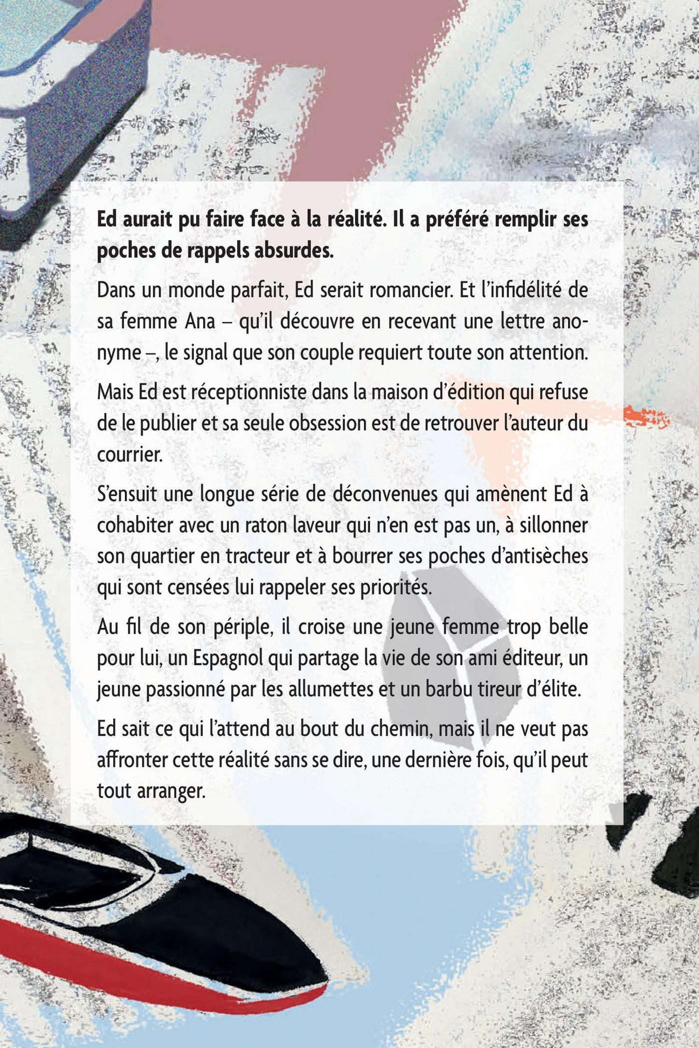 Dans un monde parfait, Ed serait romancier, et l’infidélité d’Ana, qu’il découvre en recevant une lettre anonyme, lui indiquerait que son couple requiert toute son attention.Mais Ed est réceptionniste dans une maison d’édition qui refuse de le publier, et, plutôt que de se rapprocher de sa compagne, il s’acharne à retrouver l’auteur du courrier.S’ensuit une longue série de déconvenues qui amène Ed à cohabiter avec un raton laveur qui n’en est pas un, à sillonner son quartier en tracteur, et à bourrer ses poches d’antisèches, qui sont censées lui rappeler ses priorités.Au fil de son périple, il croise une femme trop belle pour lui, un Espagnol qui partage la vie de son ami éditeur, un jeune passionné par les allumettes et un barbu tireur d’élite.Ed sait ce qui l’attend au bout du chemin, mais il ne veut pas affronter cette réalité sans se dire, une dernière fois, qu’il peut tout arranger.