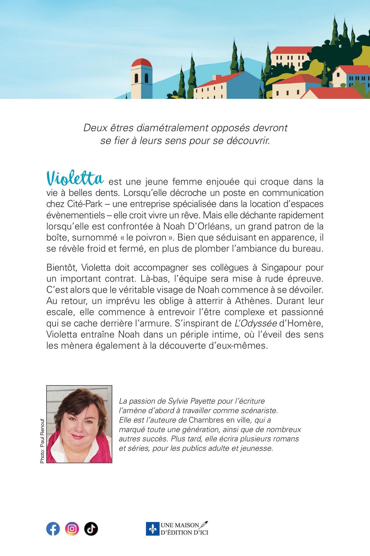 Violetta est une jeune femme enjouée qui croque dans la vie à belles dents. Lorsqu’elle décroche un poste en communication chez Cité-Park – une entreprise spécialisée dans la location d’espaces évènementiels – elle croit vivre un rêve. Mais elle déchante rapidement lorsqu’elle est confrontée à Noah D’Orléans, un grand patron de la boîte, surnommé « le poivron ». Bien que séduisant en apparence, il se révèle froid et fermé, en plus de plomber l’ambiance du bureau. Bientôt, Violetta doit accompagner ses collègues à Singapour pour un important contrat. Là-bas, l’équipe sera mise à rude épreuve. C’est alors que le véritable visage de Noah commence à se dévoiler. Au retour, un imprévu les oblige à atterrir à Athènes. Durant leur escale, elle commence à entrevoir l’être complexe et passionné qui se cache derrière l’armure. S’inspirant de L’Odyssée d’Homère, Violetta entraîne Noah dans un périple intime, où l’éveil des sens les mènera également à la découverte d’eux-mêmes.