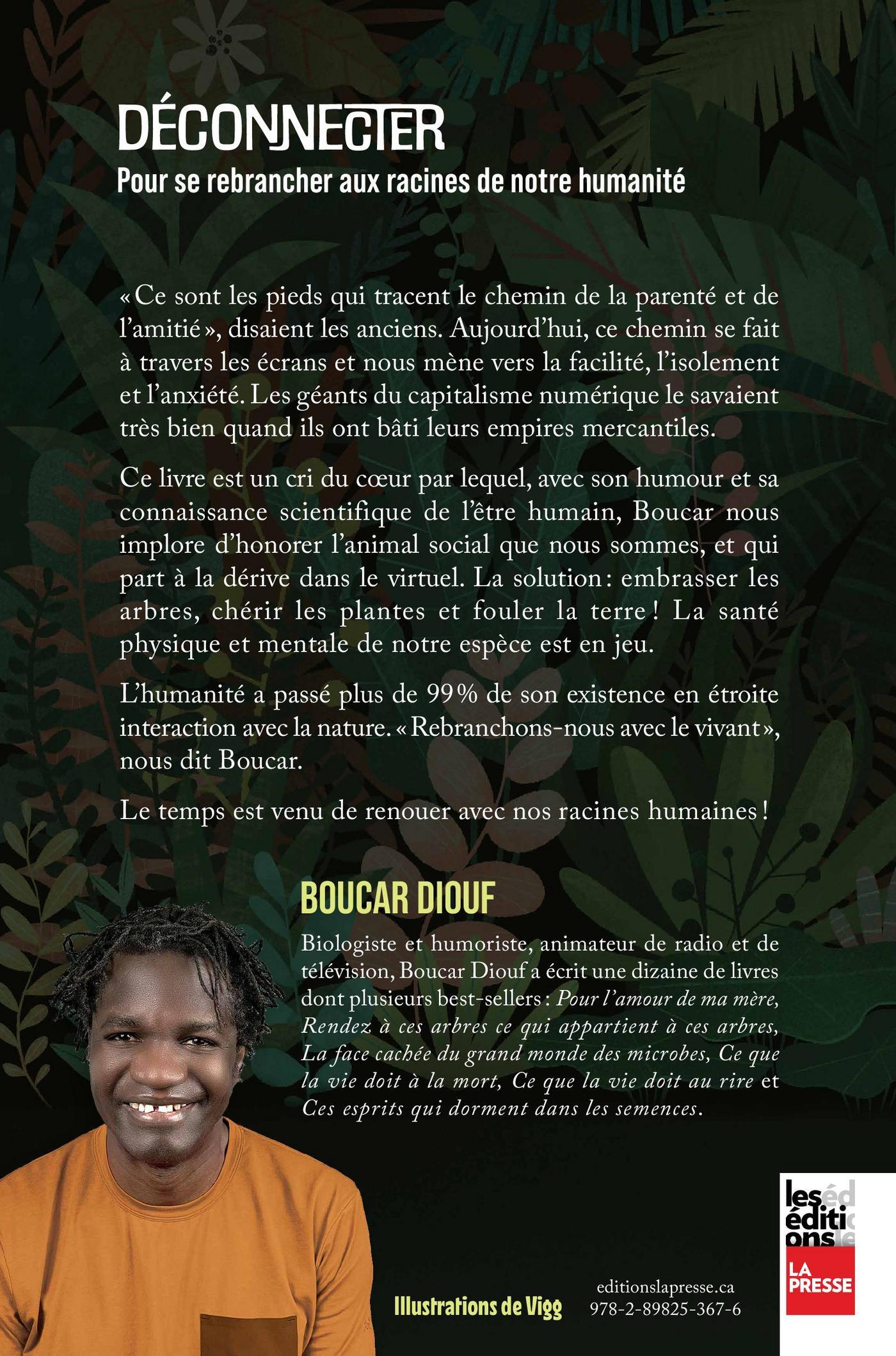«Ce sont les pieds qui tracent le chemin de la parenté et de l’amitié », disaient les anciens. Aujourd’hui, ce chemin se fait à travers les écrans et nous mène vers la facilité, l’isolement et l’anxiété. Les géants du capitalisme numérique le savaient très bien quand ils ont bâti leurs empires mercantiles.Ce livre est un cri du cœur par lequel, avec son humour et sa connaissance scientifique de l’être humain, Boucar nous implore d’honorer l’animal social que nous sommes, et qui part à la dérive dans le virtuel. La solution: embrasser les arbres, chérir les plantes et fouler la terre ! La santé physique et mentale de notre espèce est en jeu.L’humanité a passé plus de 99% de son existence en étroite interaction avec la nature. «Rebranchons-nous avec le vivant », nous dit Boucar.Le temps est venu de renouer avec nos racines humaines!
