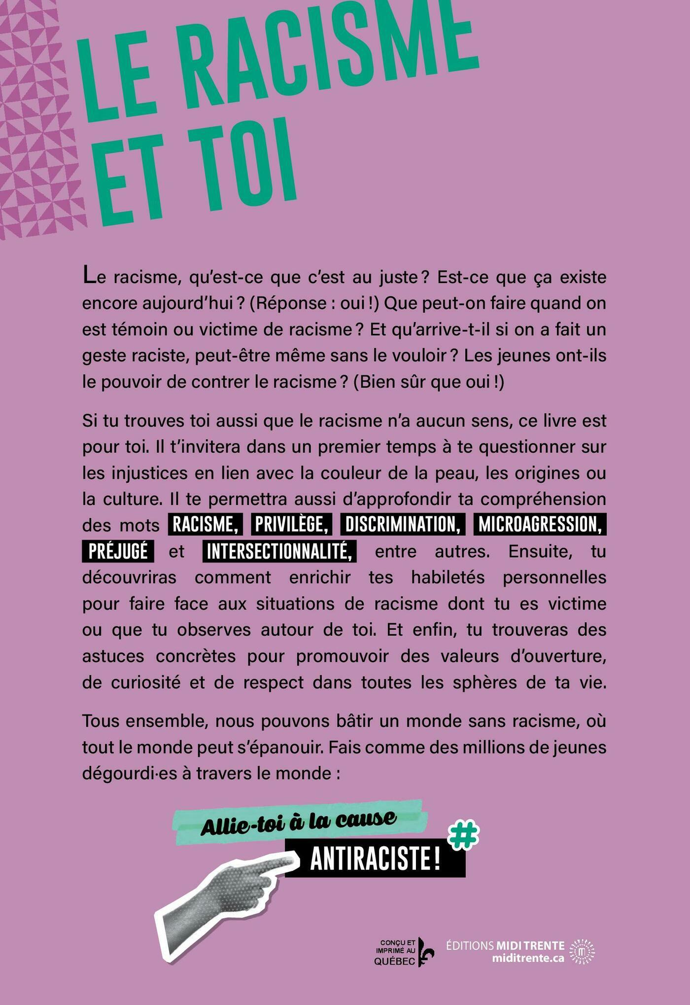 Le racisme, qu’est-ce que c’est au juste ? Est-ce que ça existe encore aujourd’hui ? (Réponse : oui !) Que peut-on faire quand on est témoin ou victime de racisme ? Et qu’arrive-t-il si on a fait un geste raciste, peut-être même sans le vouloir ? Les jeunes ont-ils le pouvoir de contrer le racisme ? (Bien sûr que oui !)Si tu trouves toi aussi que le racisme n’a aucun sens, ce livre est pour toi. Il t’invitera dans un premier temps à te questionner sur les injustices en lien avec la couleur de la peau, les origines ou la culture. Il te permettra aussi d’approfondir ta compréhension des mots racisme, privilège, discrimination, microagression, préjugé et intersectionnalité, entre autres. Ensuite, tu découvriras comment enrichir tes habiletés personnelles pour faire face aux situations de racisme dont tu es victime ou que tu observes autour de toi. Et enfin, tu trouveras des astuces concrètes pour promouvoir des valeurs d’ouverture, de curiosité et de respect dans toutes les sphères de ta vie.Tous ensemble, nous pouvons bâtir un monde sans racisme, où tout le monde peut s’épanouir. Fais comme des millions de jeunes dégourdi·es à travers le monde : allie-toi à la cause antiraciste!