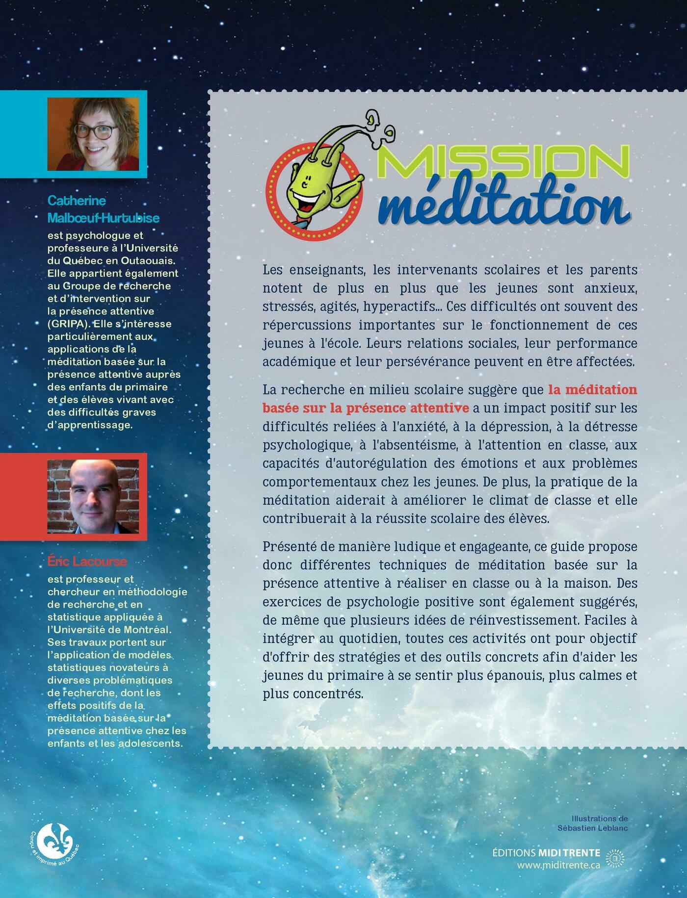 Les enseignants, les intervenants scolaires et les parents notent de plus en plus que les jeunes sont anxieux, stressés, agités, hyperactifs... Ces difficultés ont souvent des répercussions importantes sur le fonctionnement de ces jeunes à l’école. Leurs relations sociales, leur performance académique et leur persévérance peuvent en être affectées. La recherche en milieu scolaire suggère que la méditation basée sur la présence attentive a un impact positif sur les difficultés reliées à l’anxiété, à la dépression, à la détresse psychologique, à l’absentéisme, à l’attention en classe, aux capacités d’autorégulation des émotions et aux problèmes comportementaux chez les jeunes. De plus, la pratique de la méditation aiderait à améliorer le climat de classe et elle contribuerait à la réussite scolaire des élèves.Présenté de manière ludique et engageante, ce guide propose donc différentes techniques de méditation basée sur la présence attentive à réaliser en classe ou à la maison. Des exercices de psychologie positive sont également suggérés, de même que plusieurs idées de réinvestissement. Faciles à intégrer au quotidien, toutes ces activités ont pour objectif d’offrir des stratégies et des outils concrets afin d’aider les jeunes du primaire à se sentir plus épanouis, plus calmes et plus concentrés.