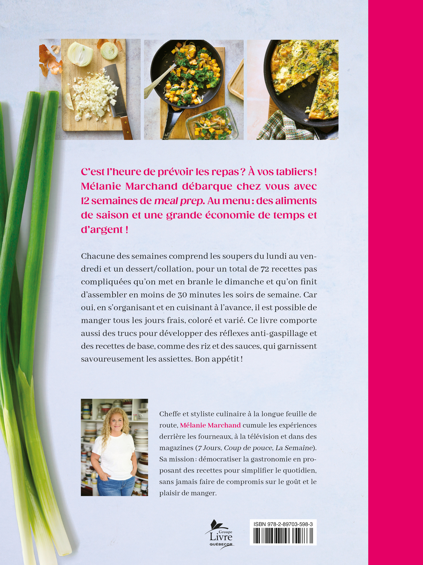 Chacune des semaines comprend les soupers du lundi au vendredi et un dessert/collation, pour un total de 72 recettes pas compliquées qu'on met en branle le dimanche et qu'on finit d'assembler en moins de 30 minutes les soirs de semaine. Car oui, en s'organisant et en cuisinant à l'avance, il est possible de manger tous les jours frais, coloré et varié. Ce livre comporte aussi des trucs pour développer des réflexes anti-gaspillage et des recettes de base, comme des riz et des sauces, qui garnissent savoureusement les assiettes. Bon appétit!