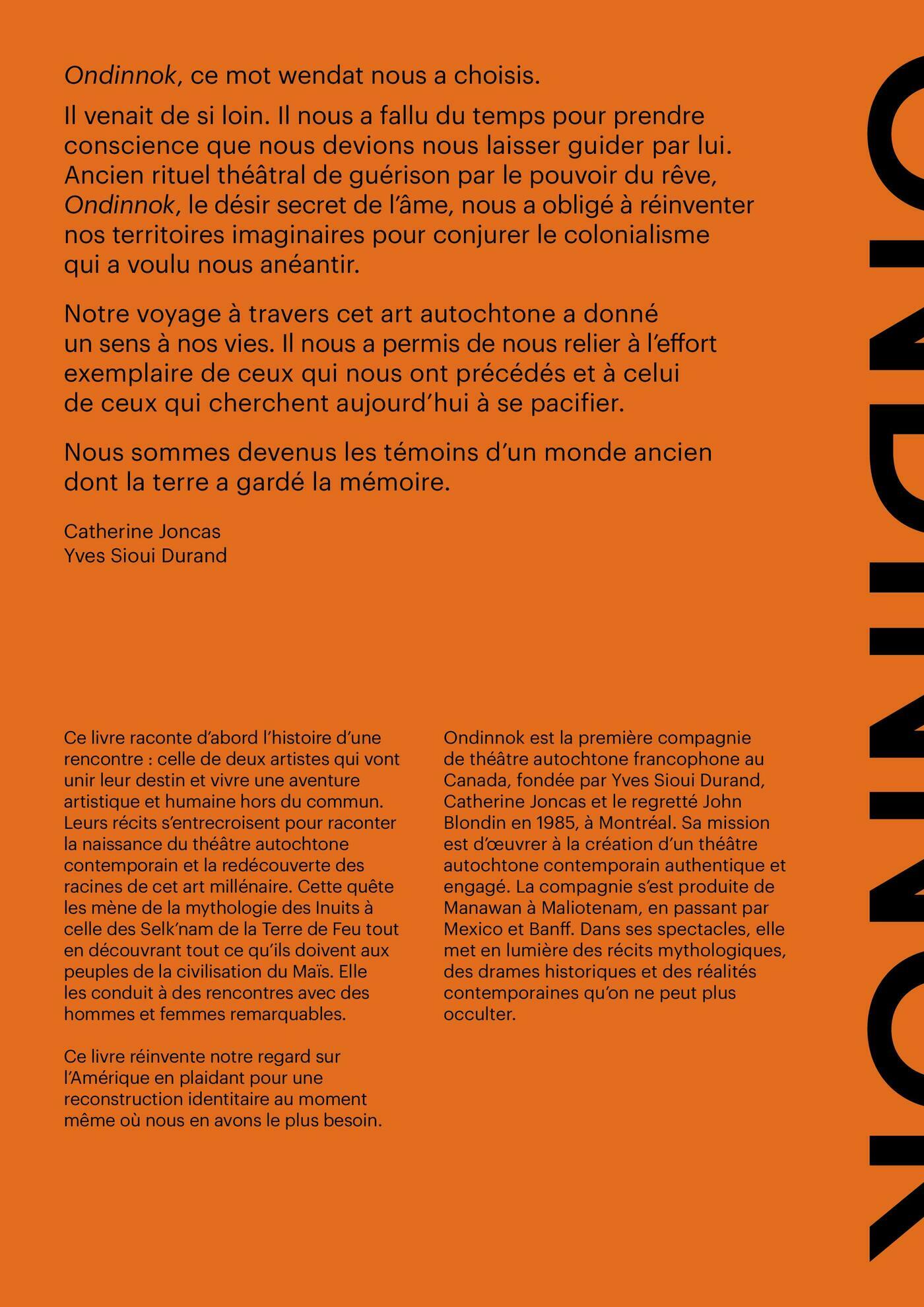 Autobiographie à quatre mains, ce livre est une rencontre : entre Yves Sioui Durand, wendat, et Catherine Joncas, québécoise, il y a cinquante ans. Une rencontre avec le théâtre millénaire des peuples autochtones des Amériques.Dès les années 70, les deux fondateurs d’Ondinnok, première compagnie de théâtre autochtone au Québec qui fête cette année ses 40 ans, vont unir leurs destins et vivre une aventure artistique et humaine hors du commun. Ensemble, ils voyageront du Québec au Mexique, en passant par le Guatemala, à la rencontre des peuples autochtones des Amériques. Leur théâtre évoluera au même rythme que la reconquête identitaire de ces peuples qui rebâtissent leur langue, et, avec elle, leurs mythes et leurs croyances. Ils participeront, à travers le théâtre de guérison, à la réémergence des mythologies autochtones, seront témoins et acteurs de la résurgence des cultures wendate et autochtones.Ce livre est donc aussi un voyage dans le temps, une redécouverte d’une histoire de l’Amérique différente de celle qui nous est communément enseignée, celle traversée notamment par le drame de Wounded Knee, les luttes de l’American Indian Movement, la résistance de Kanehsatà:ke, la contestation du mouvement Idle no more, les actions pour la vérité et la réconciliation.Animé par la pulsion créative de ce couple exceptionnel et par un puissant désir de transmission et de mémoire, nous suivons les pas des créateurs d’Ondinnok sur le fil ténu de ce qui a failli disparaître, et assistons au retissage des liens entre les Autochtones d’Amérique. Les deux auteurs partagent avec les lecteurs et lectrices la sagesse des peuples qui ont nommé ce continent, les premiers. Par ses dessins vibrants, aux traits puissants et résolument contemporains, l’artiste Kaia’tanó:ron Dumoulin Bush insuffle vie à leur aventure, mettant en lumière la richesse des mythes et créations autochtones.Ondinnok. Le désir secret de l’âme, c’est une histoire du théâtre autochtone jamais racontée, jamais écrite. Un périple fascinant, à la découverte des cultures atikamekw, innue, wendate, kanienkeha:ka, maya, inuit et selkman.