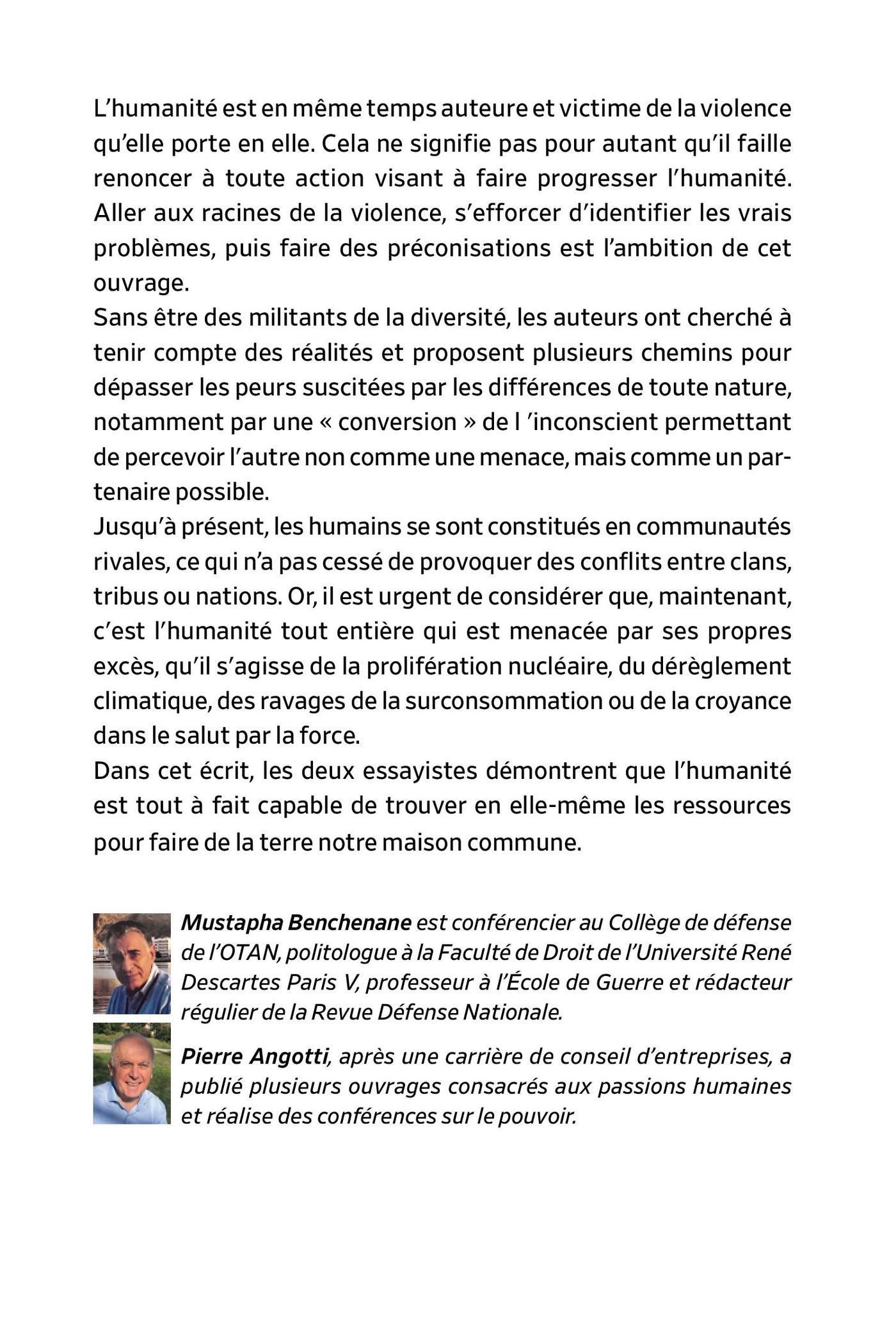 L’humanité est en même temps auteure et victime de la violence qu’elle porte en elle. Cela ne signifie pas pour autant qu'il faille se contenter de ce constat et renoncer à toute action visant à faire progresser l'humanité. Aller aux racines de la violence, s'efforcer d'identifier les vrais problèmes puis faire des préconisations est l’ambition de cet ouvrage.Sans être des militants de la diversité, les auteurs ont cherché à tenir compte des réalités et proposent plusieurs chemins pour dépasser les peurs suscitées par les différences de toute nature, notamment par une « conversion » de l 'inconscient permettant de percevoir l'autre non comme une menace mais comme un partenaire possible.Jusqu'à présent, les humains se sont constitués en communautés rivales, ce qui n’a pas cesser de provoquer des conflits entre clans, tribus ou nations. Or il est urgent de considérer que, maintenant, c'est l'humanité tout entière qui est menacée par ses propres excès, qu'il s'agisse de la prolifération nucléaire, du dérèglement climatique, des ravages de la surconsommation, de la croyance dans le salut par la force.Dans cet écrit, les deux essayistes démontrent que l'humanité est tout à fait capable de trouver en elle-même les ressources pour faire de la terre notre maison commune.