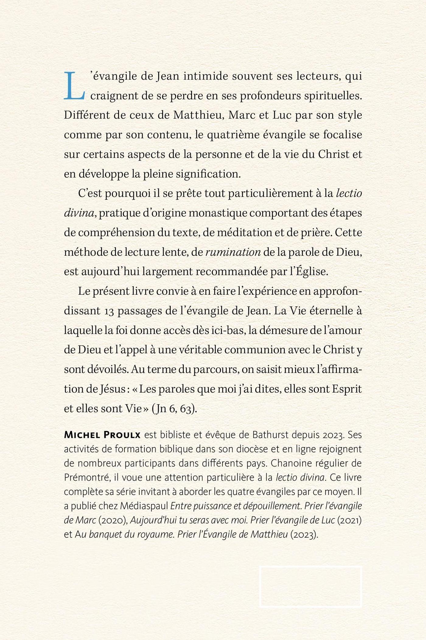 L’évangile de Jean intimide souvent ses lecteurs, qui craignent de se perdre en ses profondeurs spirituelles. Le quatrième évangile, différent de ceux de Matthieu, Marc et Luc par son style comme par son contenu, se focalise sur certains aspects clés de la personne et de la vie du Christ et en développe la signification profonde.C’est pourquoi il se prête tout particulièrement à la lectio divina, pratique d’origine monastique comportant des étapes de compréhension du texte, de méditation et de prière. Cette méthode de lecture lente, de rumination de la parole de Dieu, est aujourd’hui largement recommandée par l’Église. Le présent livre convie à en faire l’expérience en approfondissant 13 passages de l’évangile de Jean. La Vie éternelle à laquelle la foi donne accès dès ici-bas, la démesure de l’amour de Dieu et l’appel à une véritable communion avec le Christ y sont dévoilés. Au terme du parcours, on saisit mieux l’affirmation de Jésus : « Les paroles que moi j’ai dites, elles sont Esprit et elles sont Vie » (Jn 6, 63).