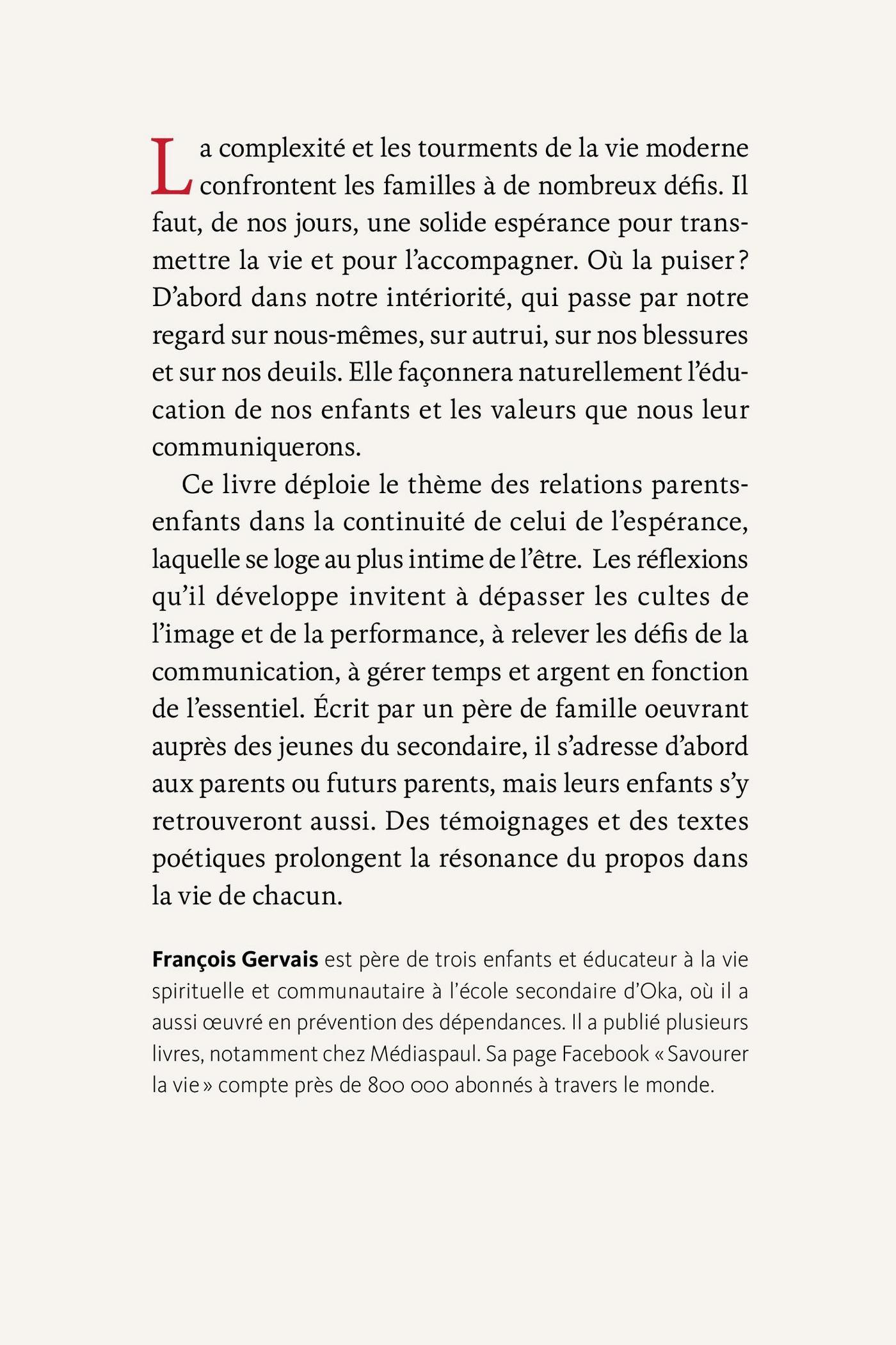 La complexité et les tourments de la vie moderne confrontent les familles à de nombreux défis. Il faut, de nos jours, une solide espérance pour transmettre la vie et pour l’accompagner. Où la puiser ? D’abord dans notre intériorité, qui passe par notre regard sur nous-mêmes, sur autrui, sur nos blessures et sur nos deuils. Elle façonnera naturellement l’éducation de nos enfants et les valeurs que nous leur communiquerons. Ce livre déploie le thème des relations parents-enfants dans la continuité de celui de l’espérance, laquelle se loge au plus intime de l’être. Les réflexions qu’il développe invitent à dépasser les cultes de l’image et de la performance, à relever les défis de la communication, à gérer temps et argent en fonction de l’essentiel. Écrit par un père de famille œuvrant auprès des jeunes du secondaire, il s’adresse d’abord aux parents ou futurs parents, mais leurs enfants s’y retrouveront aussi. Des témoignages et des textes poétiques prolongent la résonance du propos dans la vie de chacun.