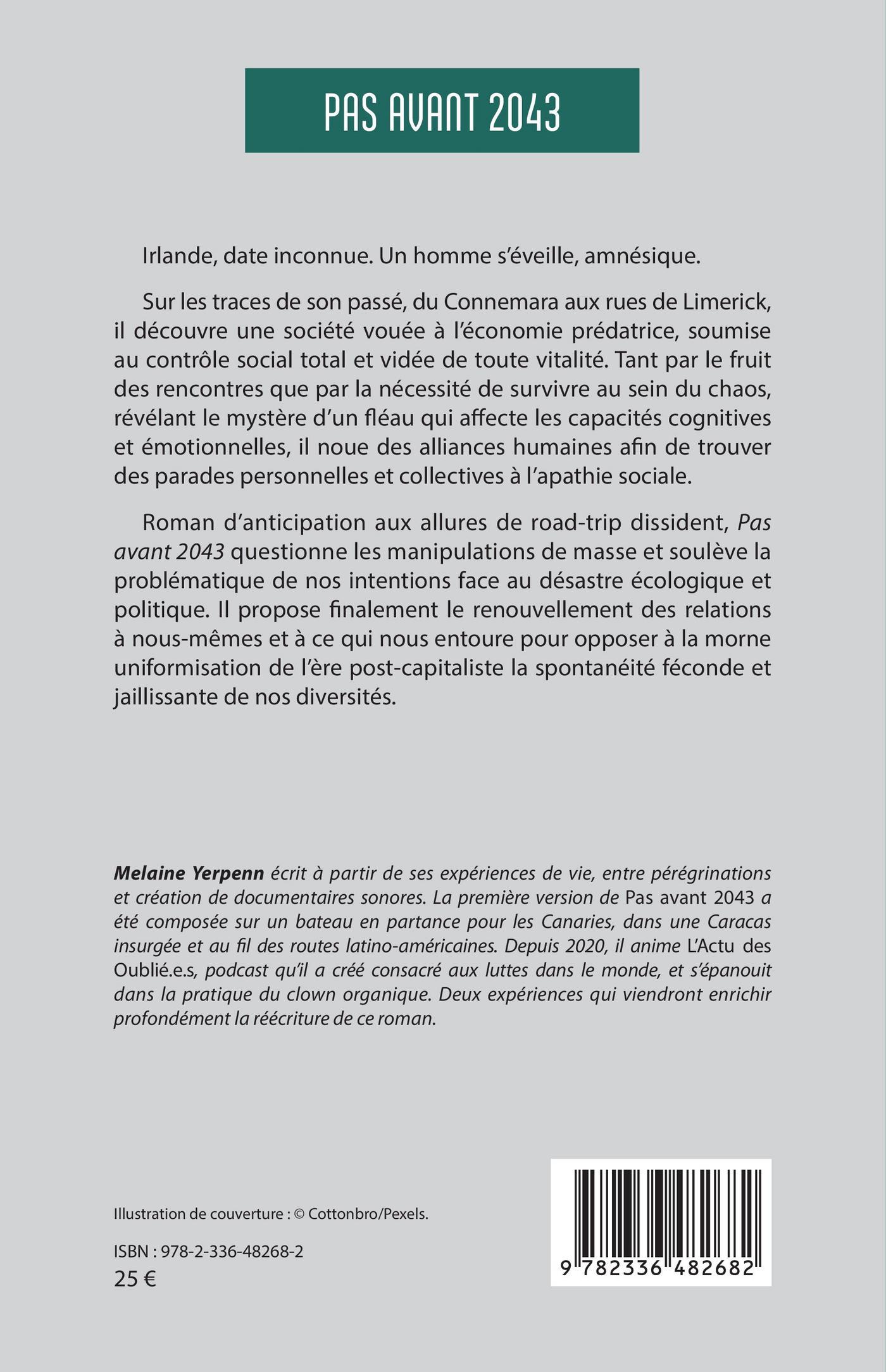 Roman d’anticipation aux allures de road-trip dissident, Pas avant 2043 questionne les manipulations de masse et soulève la problématique de nos intentions face au désastre écologique et politique. Il propose finalement le renouvellement des relations à nous-mêmes et à ce qui nous entoure pour opposer à la morne uniformisation de l’ère post-capitaliste la spontanéité féconde et jaillissante de nos diversités.
