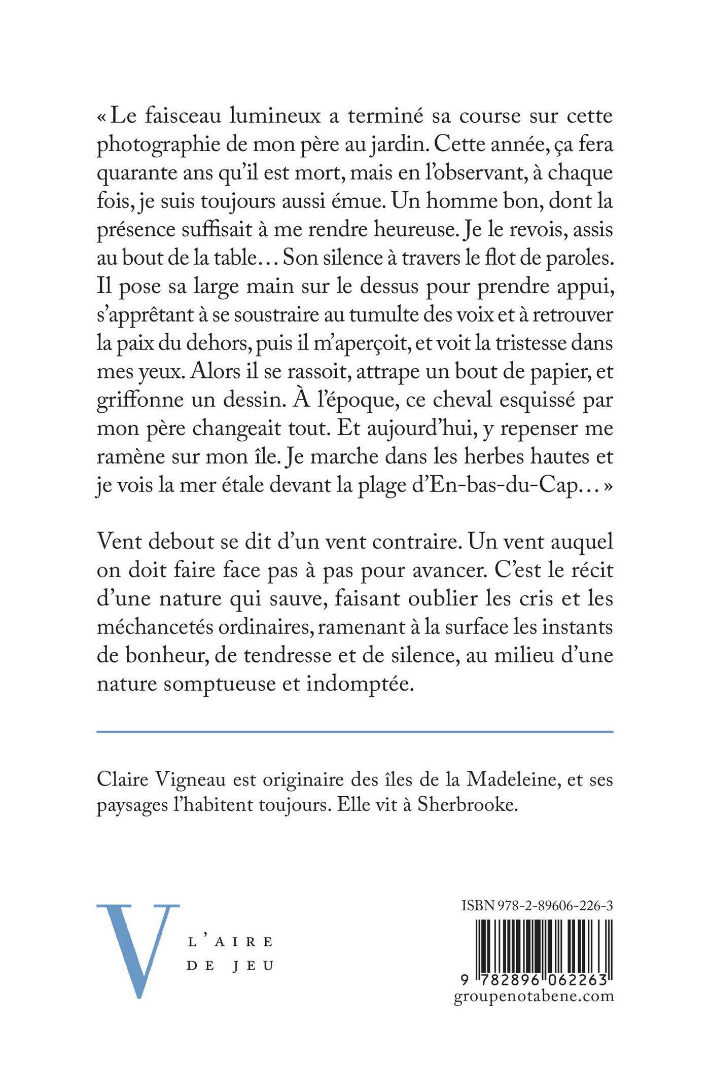 Vent debout se dit d’un vent contraire.Un vent auquel on doit faire face pas à pas pour avancer. C’est le récit d’une nature qui sauve, faisant oublier les cris et les méchancetés ordinaires, ramenant à la surface les instants de bonheur, de tendresse et de silence, au milieu d’une nature somptueuse et indomptée.Une narratrice revisite son enfance pour transmettre la beauté d’un mode de vie presque oublié en racontant les travaux sur la ferme, les rapports étroits avec les animaux, la pêche, la récolte des coques, des palourdes, et la cueillette des petits fruits sauvages. Certains moments vécus nous habitent tout le long de notre vie, et ce sont ces instants de bonheur, de tendresse et de silence, qui sont ramenés à la surface.