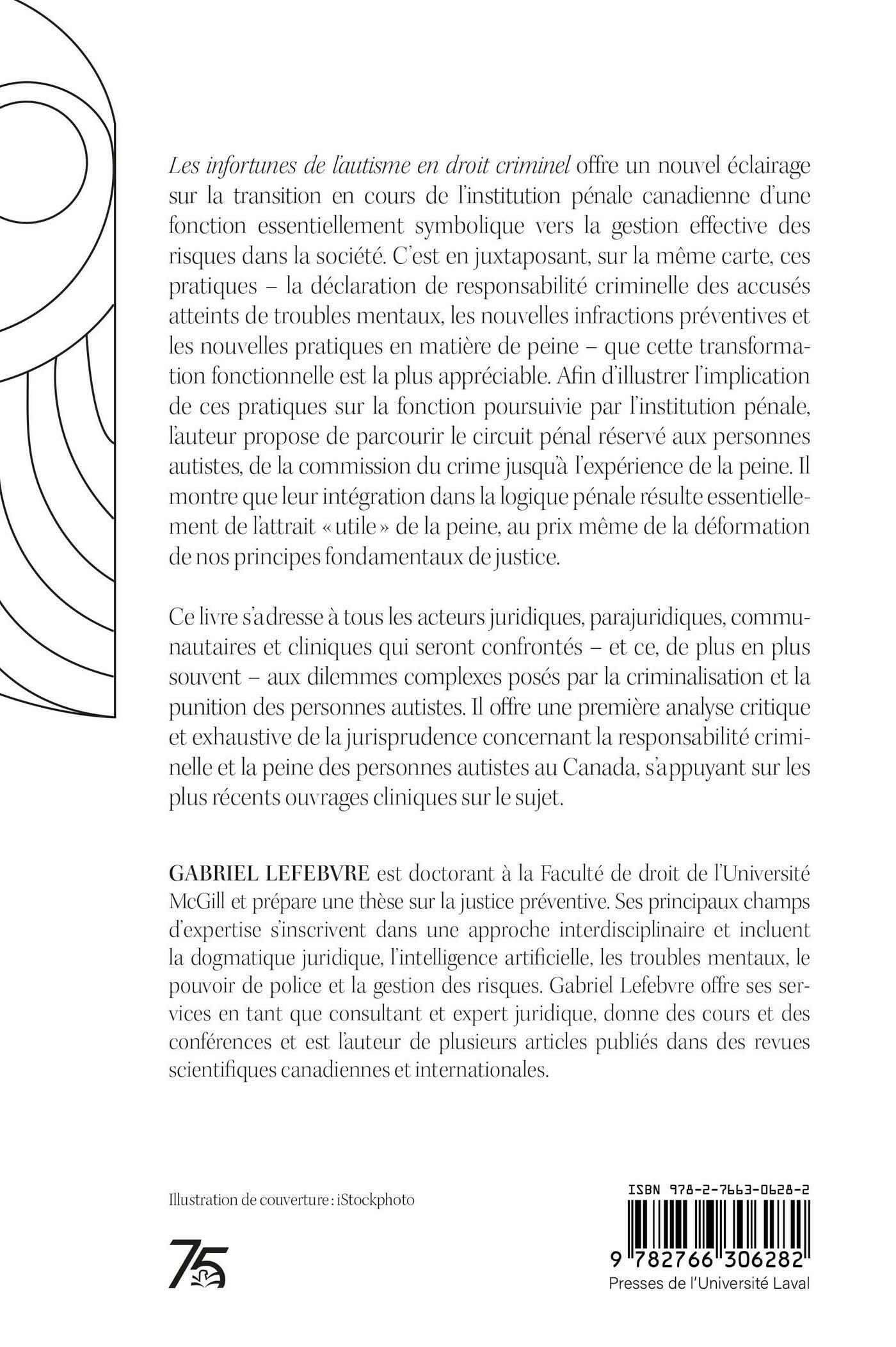 Ce livre s’adresse à tous les acteurs juridiques, parajuridiques, communautaires et cliniques qui seront confrontés – et ce, de plus en plus souvent – aux dilemmes complexes posés par la criminalisation et la punition des personnes autistes. Il offre une première analyse critique et exhaustive de la jurisprudence concernant la responsabilité criminelle et la peine des personnes autistes au Canada, s’appuyant sur les plus récents ouvrages cliniques sur le sujet.