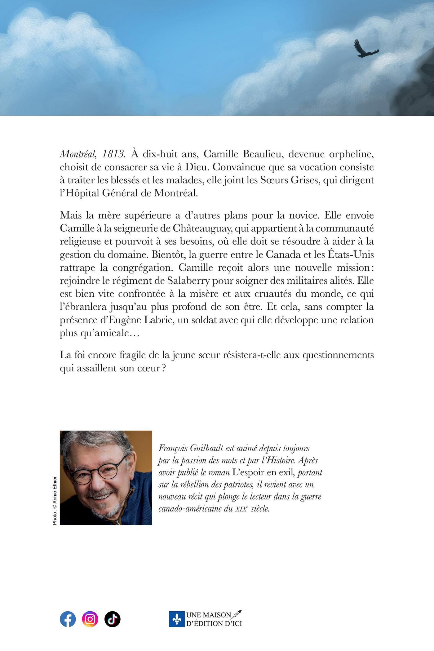 Montréal, 1813. À dix-huit ans, Camille Beaulieu, devenue orpheline, choisit de consacrer sa vie à Dieu. Convaincue que sa vocation consiste à traiter les blessés et les malades, elle joint les Sœurs Grises, qui dirigent l’Hôpital Général de Montréal.Mais la mère supérieure a d’autres plans pour la novice. Elle envoie Camille à la seigneurie de Châteauguay, qui appartient à la communauté religieuse et pourvoit à ses besoins, où elle doit se résoudre à aider à la gestion du domaine. Bientôt, la guerre entre le Canada et les États-Unis rattrape la congrégation. Camille reçoit alors une nouvelle mission : rejoindre le régiment de Salaberry pour soigner des militaires alités. Elle est bien vite confrontée à la misère et aux cruautés du monde, ce qui l’ébranlera jusqu’au plus profond de son être. Et cela, sans compter la présence d’Eugène Labrie, un soldat avec qui elle développe une relation plus qu’amicale… La foi encore fragile de la jeune sœur résistera-t-elle aux questionnements qui assaillent son cœur ?