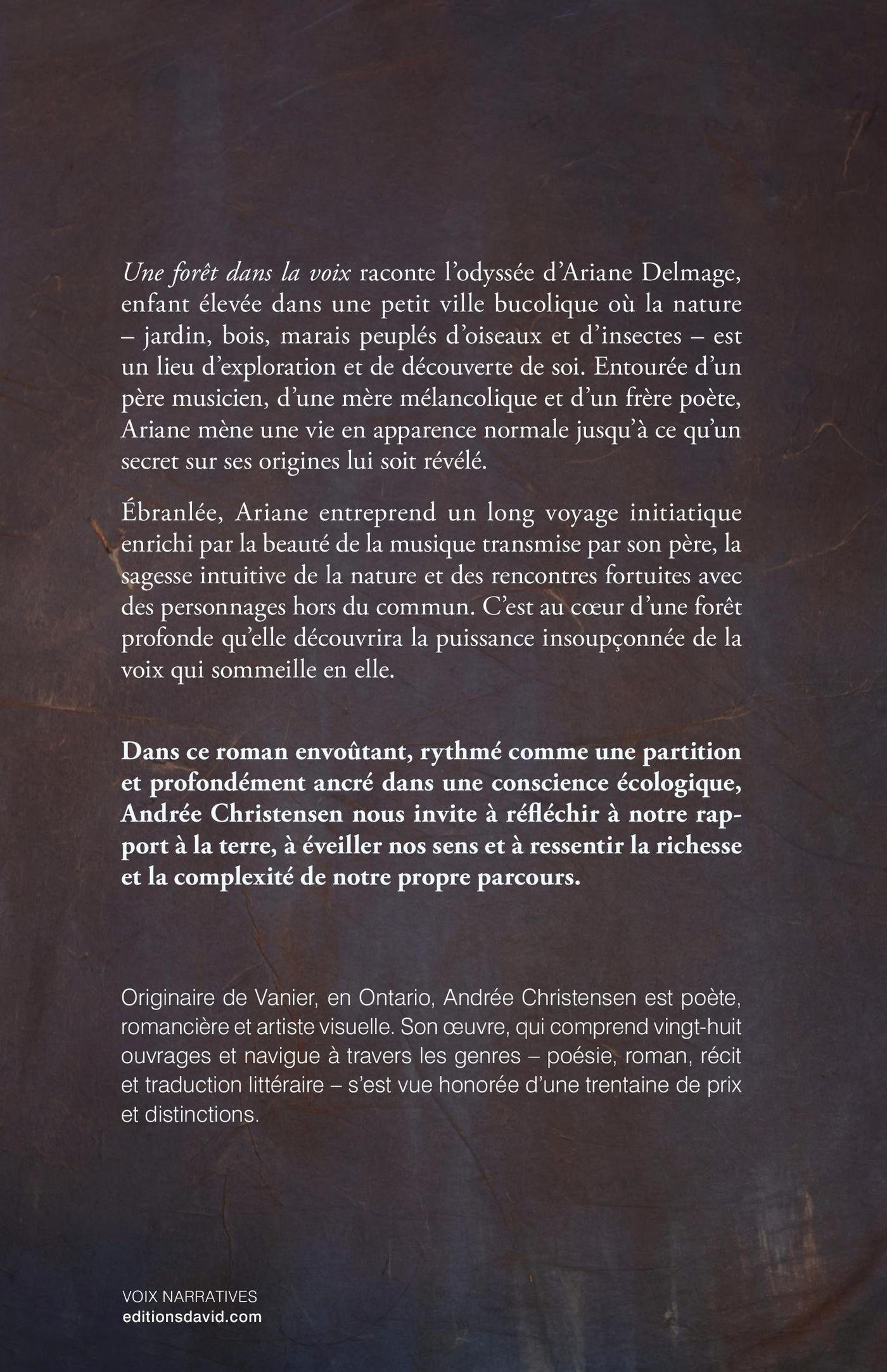 Une forêt dans la voix raconte l’odyssée d’Ariane Delmage, enfant élevée dans une petit ville bucolique où la nature – jardin, bois, marais peuplés d’oiseaux et d’insectes – est un lieu d’exploration et de découverte de soi. Entourée d’un père musicien, d’une mère mélancolique et d’un frère poète, Ariane mène une vie en apparence normale jusqu’à ce qu’un secret sur ses origines lui soit révélé.Ébranlée, Ariane entreprend un long voyage initiatique enrichi par la beauté de la musique transmise par son père, la sagesse intuitive de la nature et des rencontres fortuites avec des personnages hors du commun. C’est au coeur d’une forêt profonde qu’elle découvrira la puissance insoupçonnée de la voix qui sommeille en elle.Dans ce roman envoûtant, rythmé comme une partition et profondément ancré dans une conscience écologique, Andrée Christensen nous invite à réfléchir à notre rapport à la terre, à éveiller nos sens et à ressentir la richesse et la complexité de notre propre parcours.Originaire de Vanier, en Ontario, Andrée Christensen est poète, romancière et artiste visuelle. Son oeuvre, qui comprend vingt-huit ouvrages et navigue à travers les genres – poésie, roman, récit et traduction littéraire – s’est vue honorée d’une trentaine de prix et distinctions.